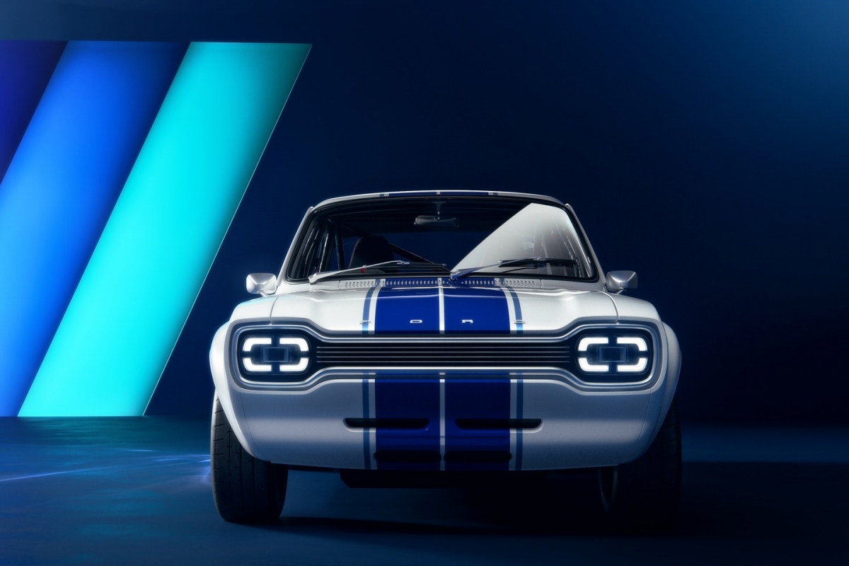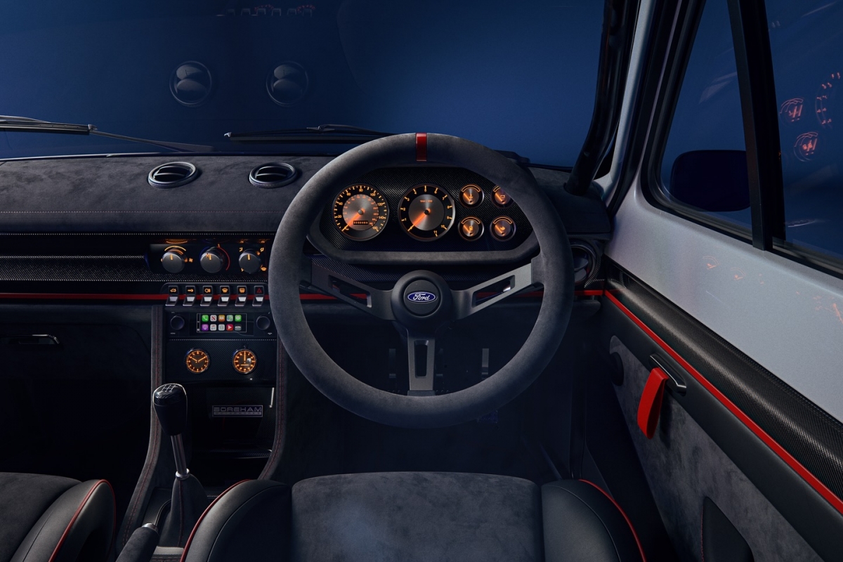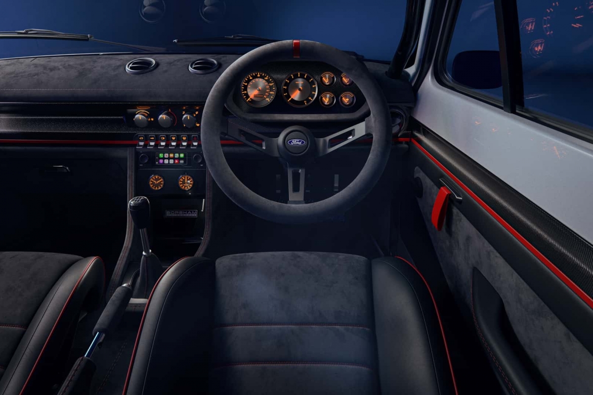 O exterior do relançamento da Boreham Motorworks mantém a silhueta icónica do Escort RS MKI original, com as suas cavas das rodas alargadas e a arrojada grelha frontal. A Boreham Motorworks, cujo nome deriva da sede da equipa de ralis da Ford, sediada em Essex, assegurou cuidadosamente que todas as curvas e detalhes respeitassem o legado do original, ao mesmo tempo que introduzia subtis melhorias modernas. Os faróis LED e a carroçaria leve em fibra de carbono asseguram que o carro tem um aspeto clássico, mas é contemporâneo.