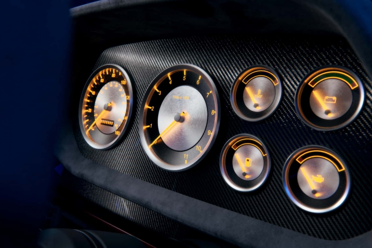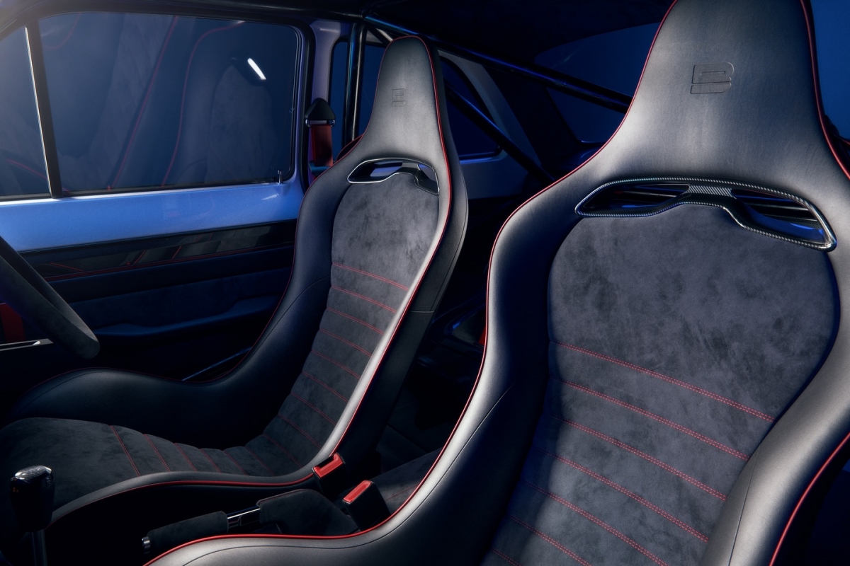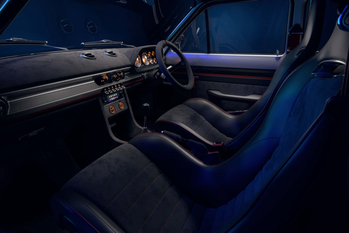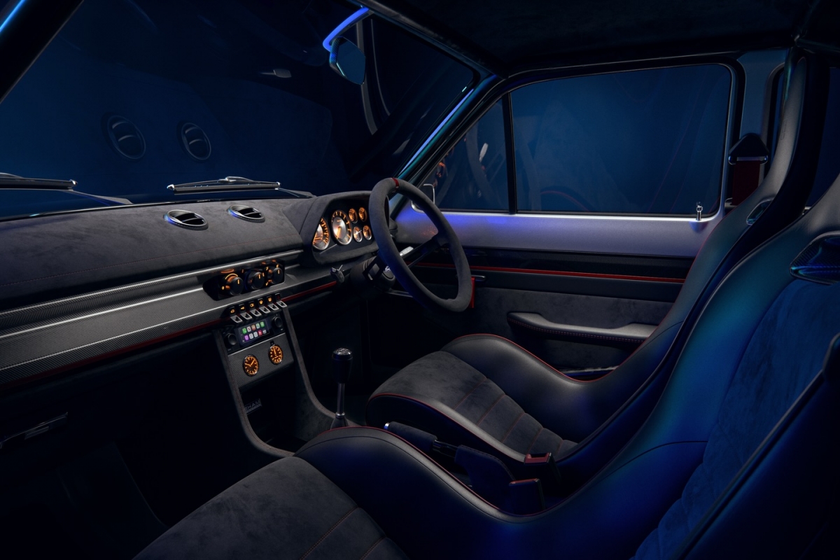 No interior, o habitáculo combina uma estética retro com o luxo do século XXI. Dispõe de ar condicionado e o painel de instrumentos apresenta indicadores de estilo analógico juntamente com um discreto ecrã digital para telemetria personalizável. Os bancos em pele de alta qualidade, os padrões de costura retro e as opções de conetividade modernas, como o carregamento sem fios e a integração de smartphones, proporcionam conforto e comodidade sem comprometer o ambiente nostálgico.