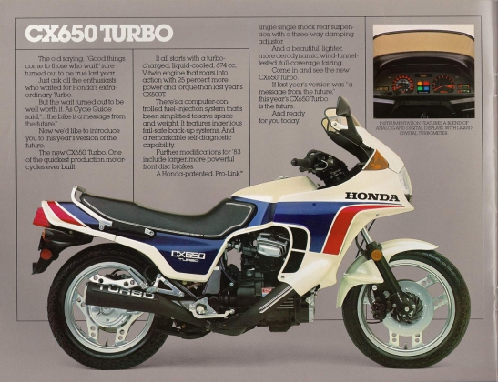 Neste artigo encontramos uma das 1777 exemplares construídas da Honda CX650 Turbo, e que foi levada a leilão no passado dia 14 de Outubro, através de um evento levado a cabo pela Bonhams, em Stafford, aquando do Classic Motorcycle Mechanics Show, sendo vendida por 9.200 libras, cerca de 10.700 euros.
