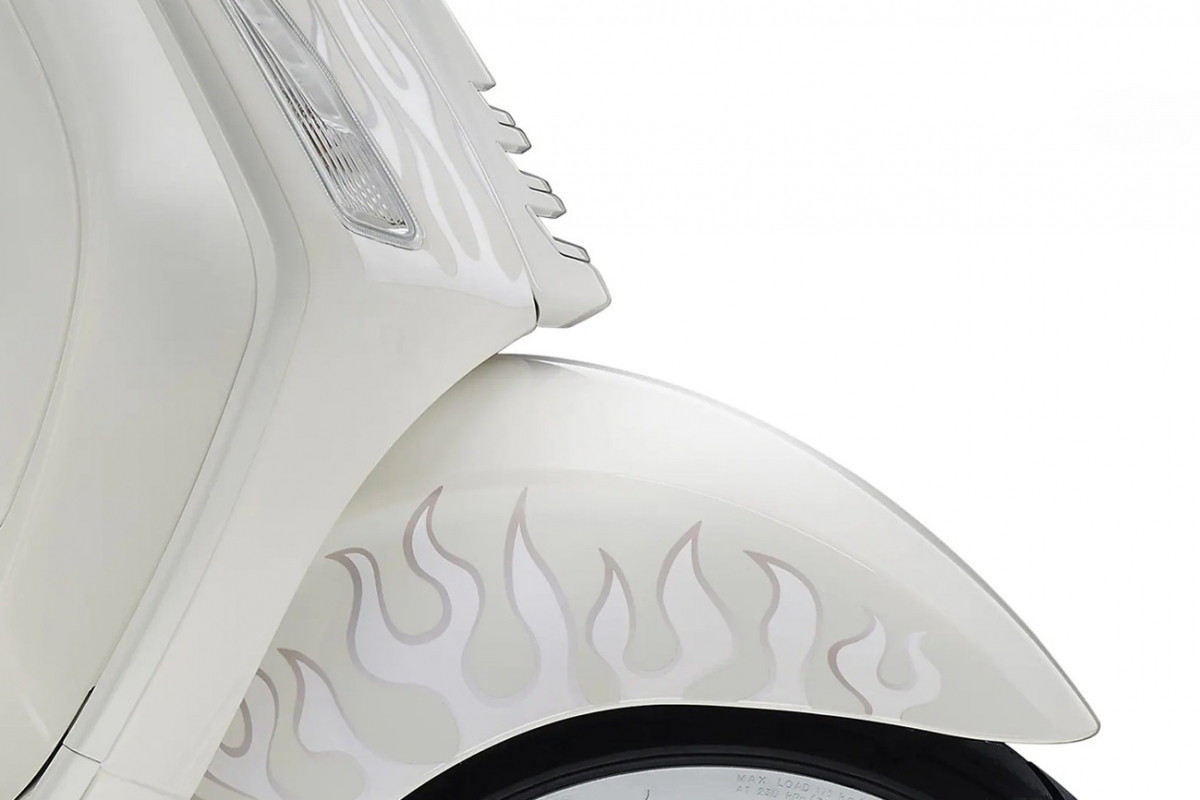 Da parceria entre os dois ícones de estilo nasceu a “Justin Bieber x Vespa”, uma moto que se caracteriza principalmente pela decoração monocromática. O cantor decidiu não complicar na hora de colocar as suas ideias no papel, optando por uma decoração do tipo branco total, a cor escolhida para todos os elementos, incluindo as bonitas jantes de 12 polegadas e os punhos. Os únicos apontamentos com tons diferentes (além dos pneus, claro) são os desenhos de chamas nas laterais e a assinatura com o seu nome.