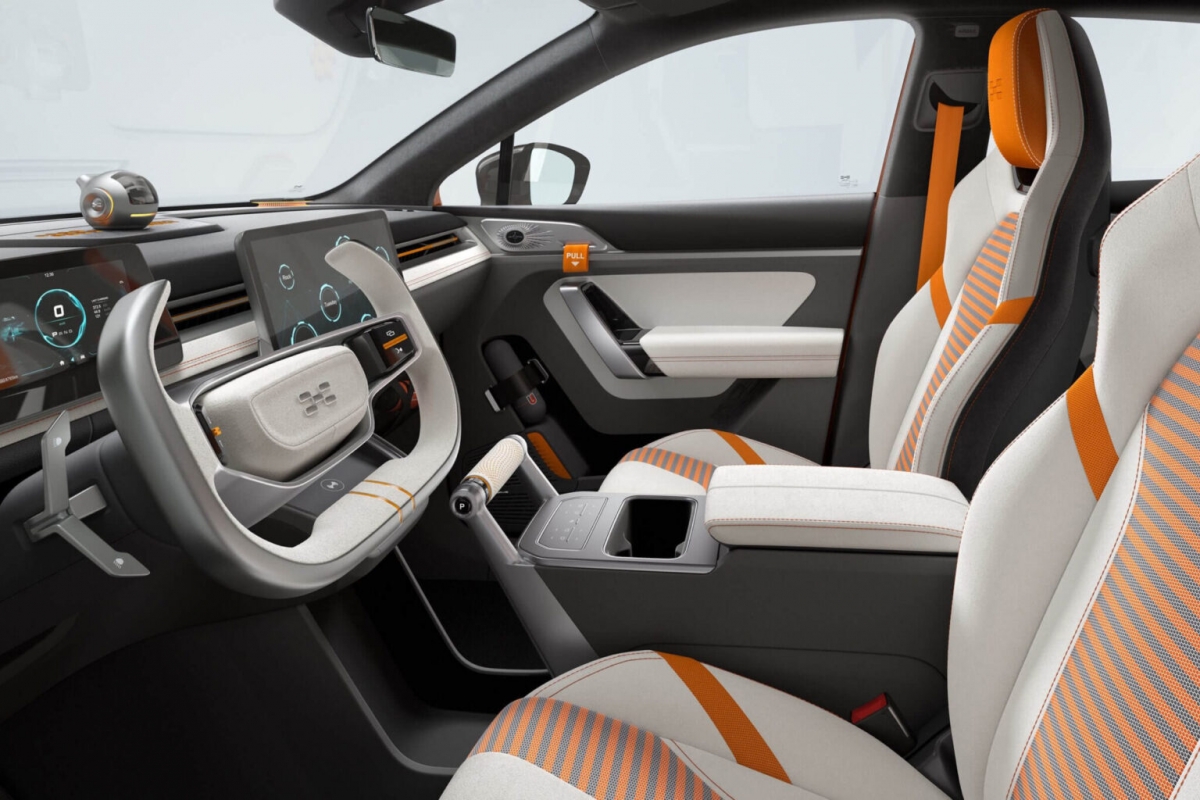 No interior, decoração moderna inspirada no concept, com instrumentação digital de 7,0 polegadas e ecrã central de 14,6 polegadas, e com volante do tipo manche de avião.
