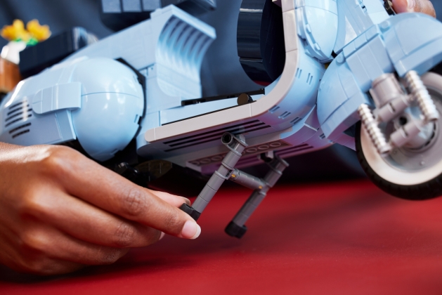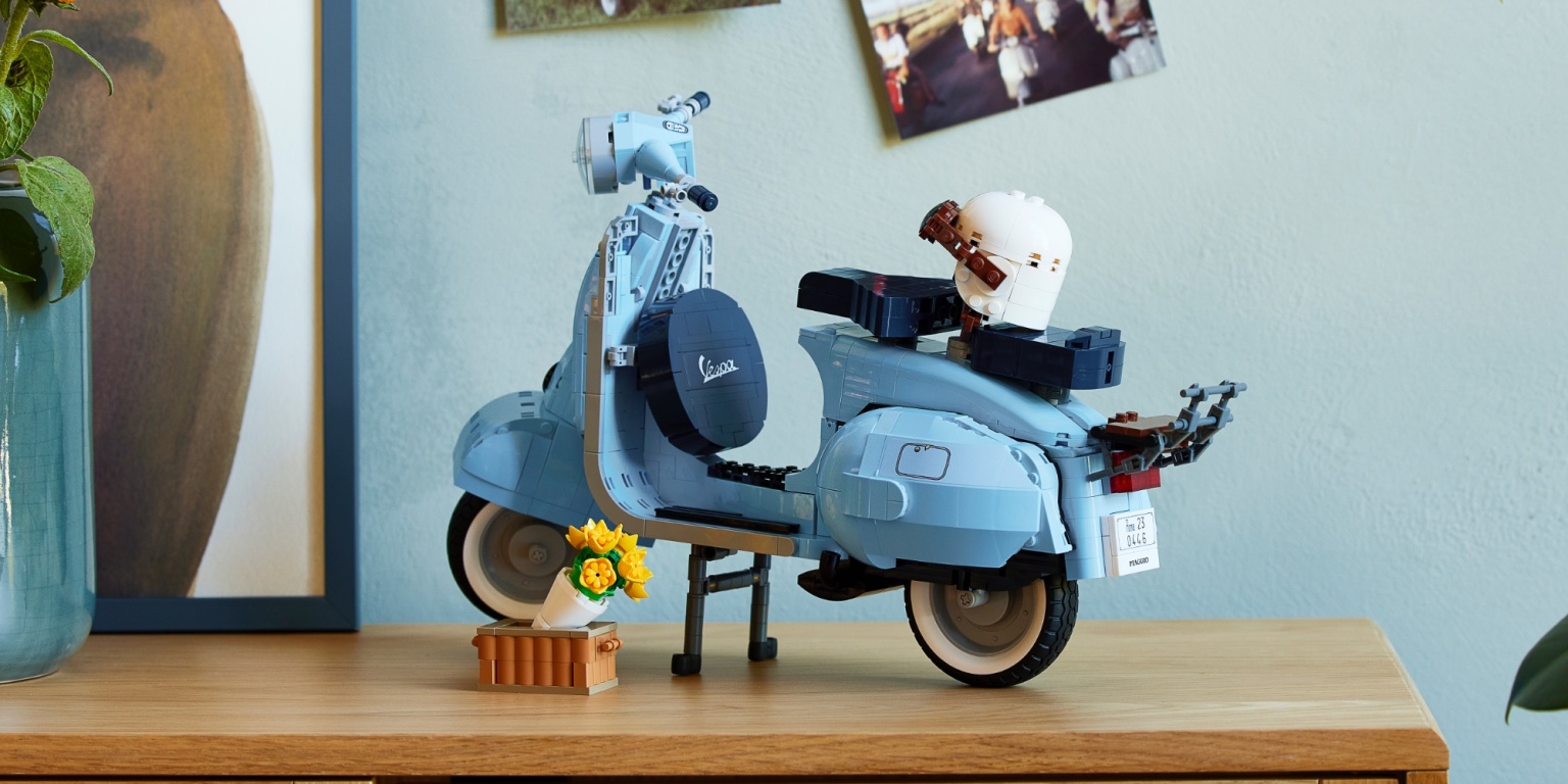 Para celebrar o 75º aniversário da Vespa, os designers LEGO trabalharam com a icónica marca italiana para recriar este modelo mítico numa construção imersiva, especialmente para adultos. Tal como o original, a Vespa clássica para construir em casa apresenta uma roda dianteira montada de um lado, dois assentos, uma tampa do motor removível com um motor construído com peças por baixo, um descanso funcional, além de uma direção funcional.
