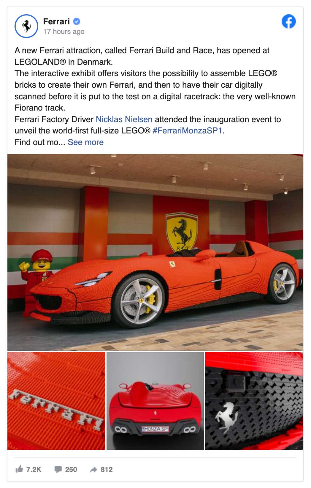 Sob a égide: “Ferrari Build and Race”, é possível ver um Ferrari Monza SP1, em tamanho real, com jantes e pneus verdadeiros, mas tudo o resto é feito com os icónicos blocos de plástico. Os visitantes têm ainda a oportunidade de construir o seu próprio Ferrari com as peças da Lego. Depois de digitalizado, é criada uma versão 3D que pode ser experimentada na pista virtual de testes da marca em Fiorano.