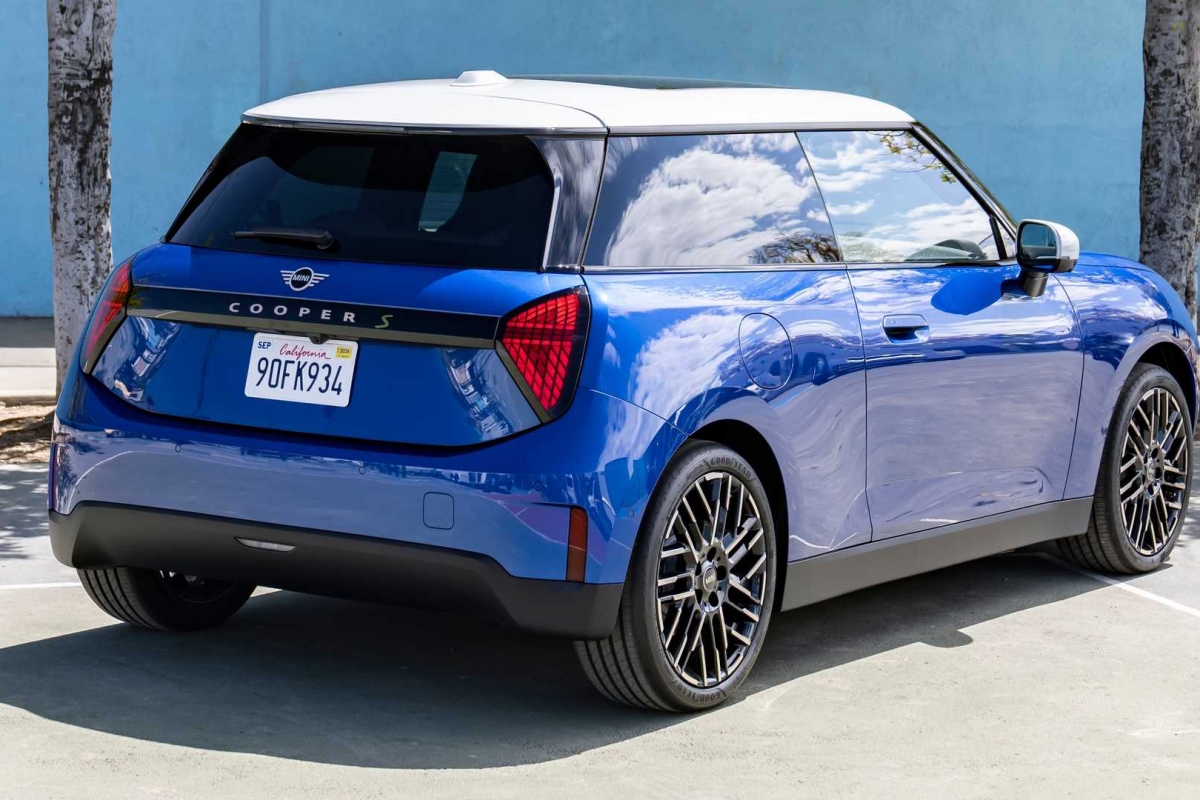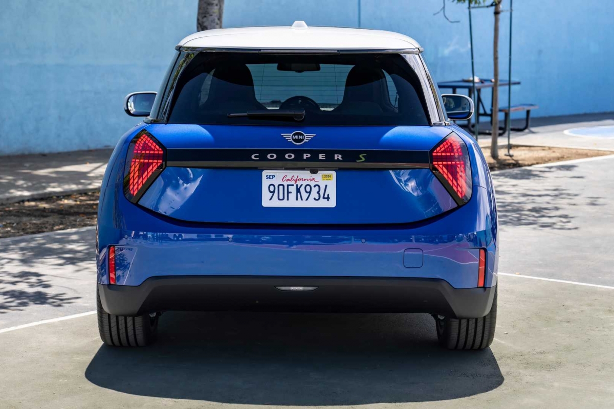 Os farolins passam a assumir um formato trapezoidal com padrão no interior e existe uma barra preta atravessa todo o portão da mala. Já presença de um “S” na cor verde indica que se trata, exatamente, da versão Cooper S Electric.