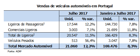 Em termos acumulados, de janeiro a julho de 2017, foram matriculados 169.476 veículos automóveis novos, o que representou um crescimento homólogo de 8,3%