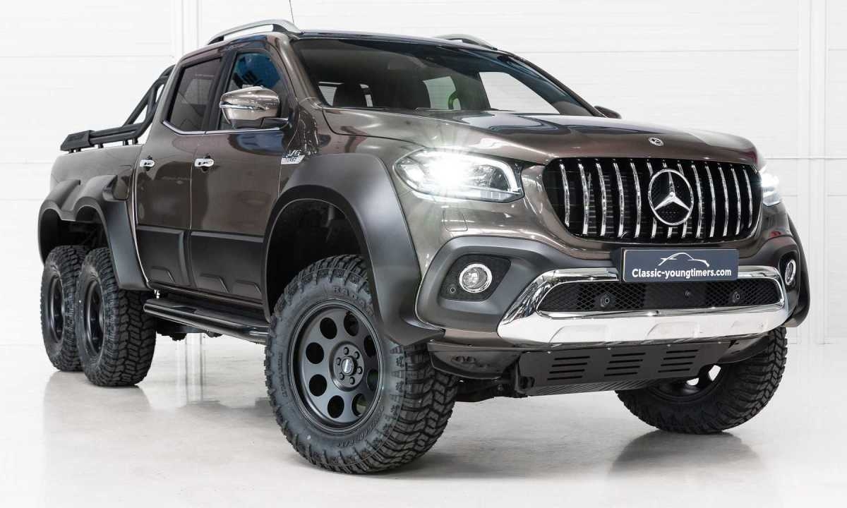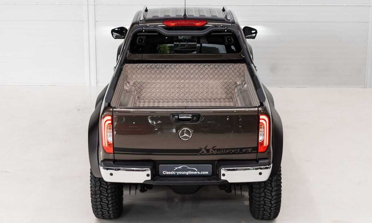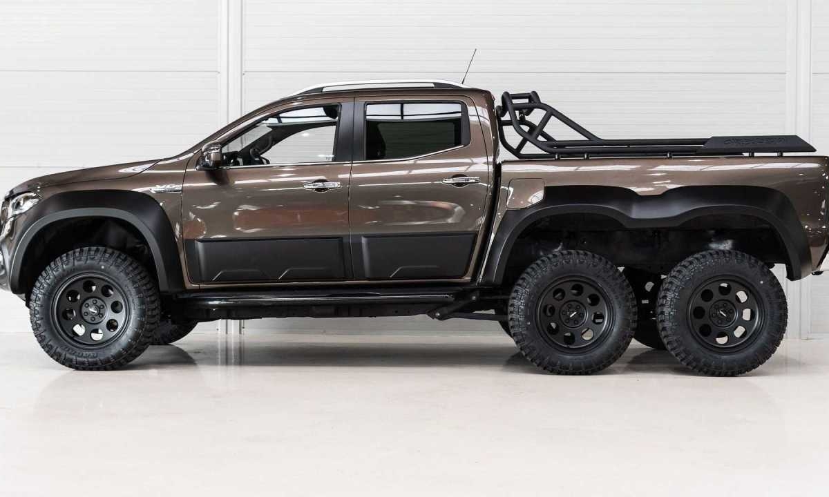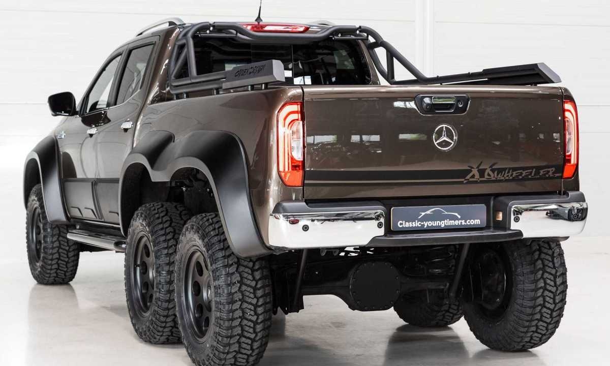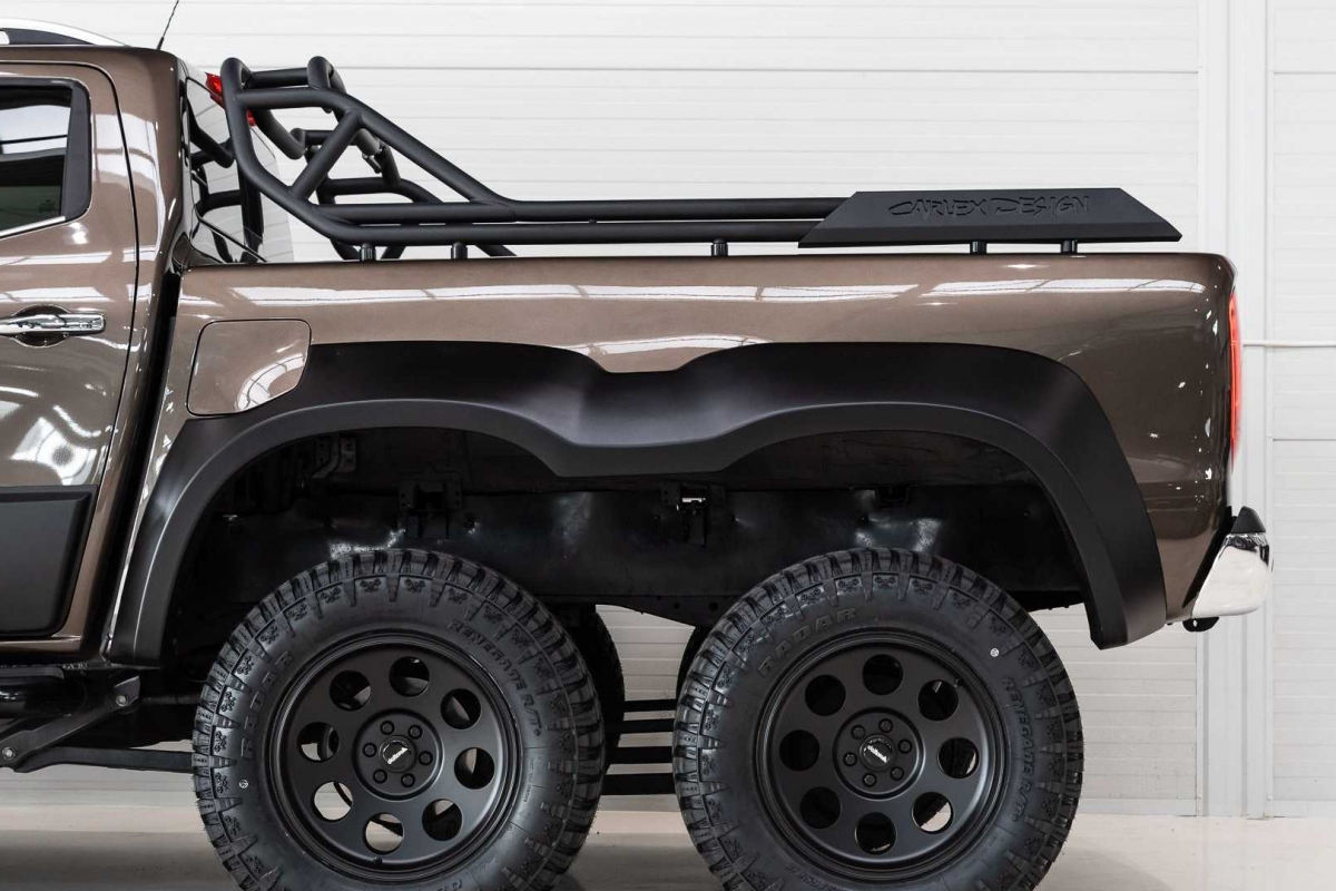 O modelo personalizado foi construído em 2020, obrigando a “esticar” a base rolante para integrar um terceiro eixo na parte traseira. A altura ao solo também aumentou 10 cm, enquanto a carroçaria recebeu vários elementos novos, desde as redesenhadas cavas das rodas às barras tubulares instaladas na caixa de carga, cortesia da Carlex Design.
