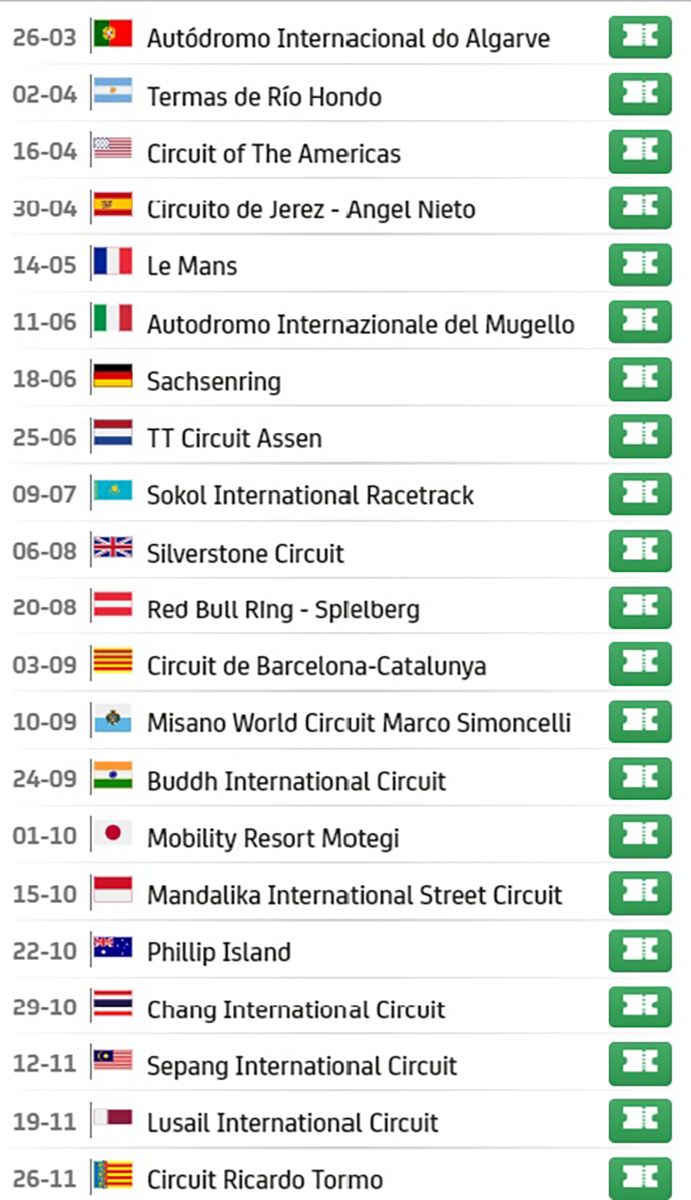 Lembramos ainda que o MotoGP vai começar já, pela primeira vez, com a ronda portuguesa nos dias 24 a 26 de março, em Portimão e termina em Espanha de 24 a 26 de novembro, em Valência.