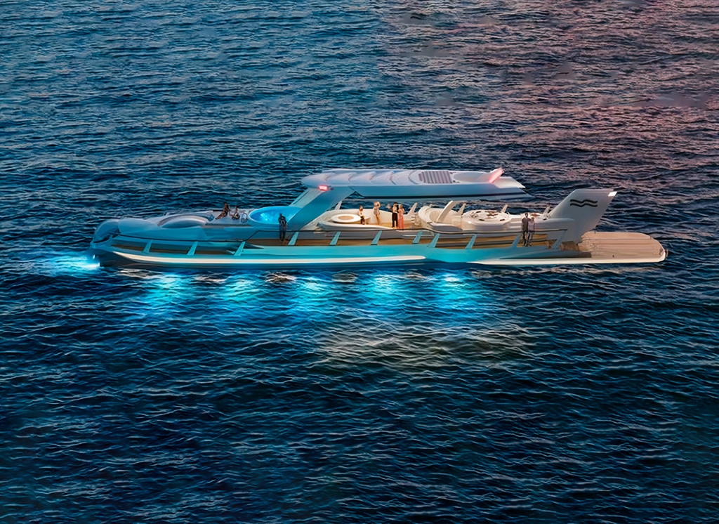 Como superiate, o Nautilus cumpre todos os requisitos, oferecendo piscina, bar, salão e zona de refeições no exterior, instalados em estruturas que são retráteis para que possam ‘esconder-se’ quando se ativa o modo submarino.