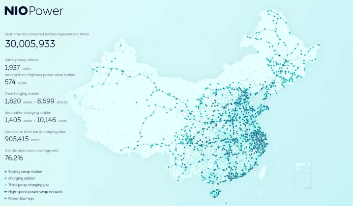 No entanto a tecnologia da Nio parece funcionar bastante bem no mercado chinês, onde tem já 1,937 estações de troca, chamadas PSS (Power Swap Stations). A primeira troca foi efetuada em maio de 2018 numa estação em Shenzhen. Em junho de 2022, passados quatro anos a marca atingia os 10 milhões de trocas efetuadas. Nove meses depois, já em abril de 2023 chegava aos 20 milhões, e alcançou agora o marco de 30 milhões.