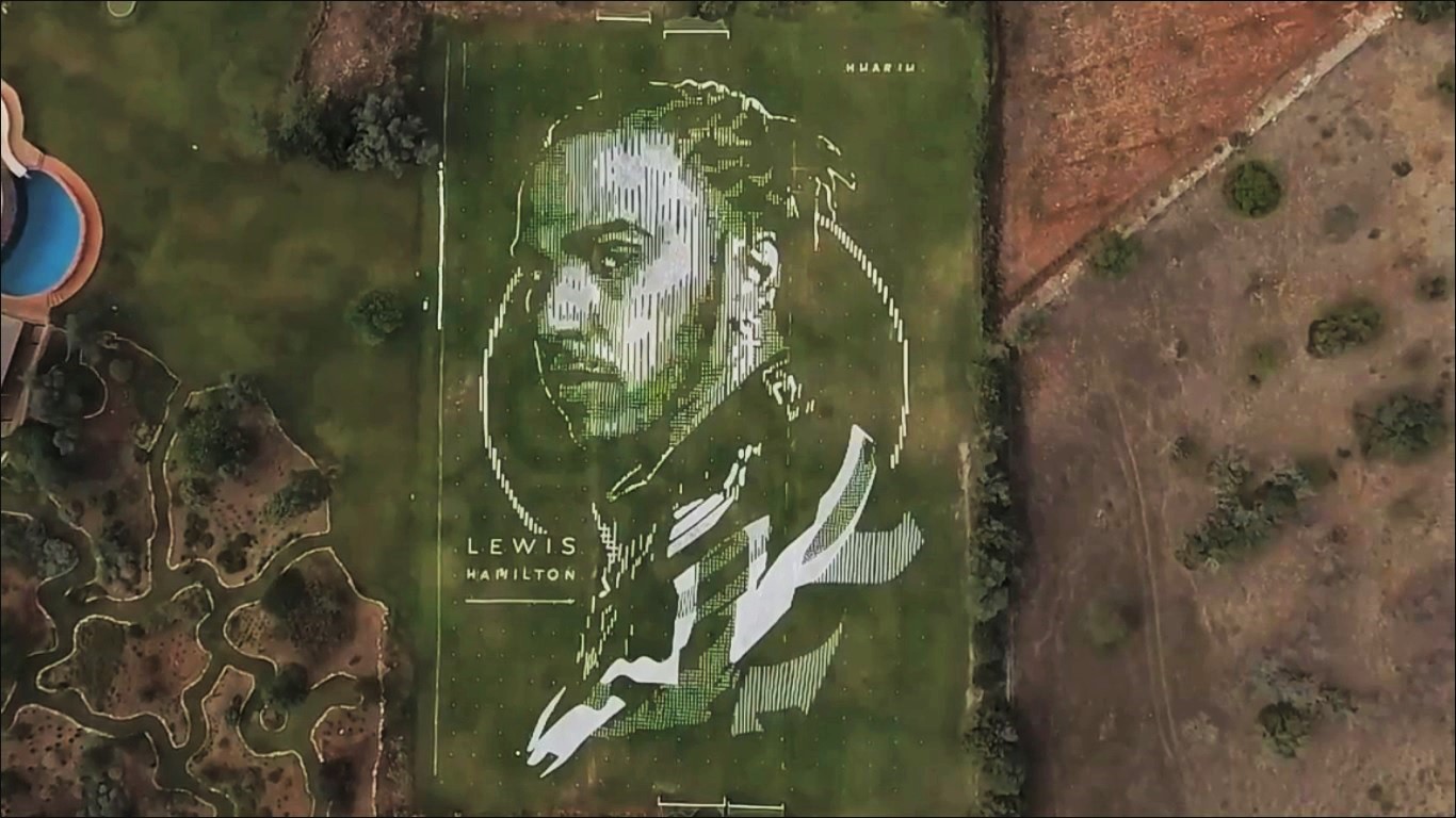 Hamilton recorreu à sua conta de Instagram para divulgar o vídeo da feitura do incrível retrato criado pelo artista Huariu, no relvado de um campo de futebol na Mexilhoeira Grande, confessando-se totalmente siderado com a obra.