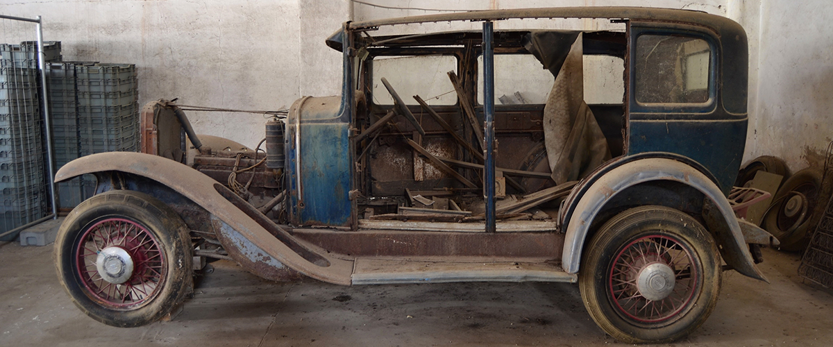 Após uma primeira limpeza urgente, procedeu-se ao inventário dos caixotes de peças que acompanharam o automóvel; surpreendentemente, todos os elementos se encontravam presentes, desde os faróis aos puxadores das portas. Também a condição da chapa se revelou uma agradável surpresa, tendo conseguido evadir-se à ferrugem séria, acumulando apenas a de superfície.