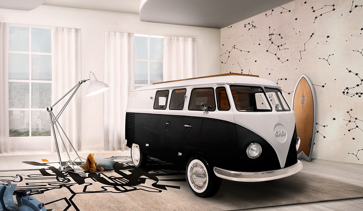Empresa portuguesa de mobiliário juvenil comercializa réplica perfeita do clássico da Volkswagen, com cama, secretária e televisão para levar para o quarto.