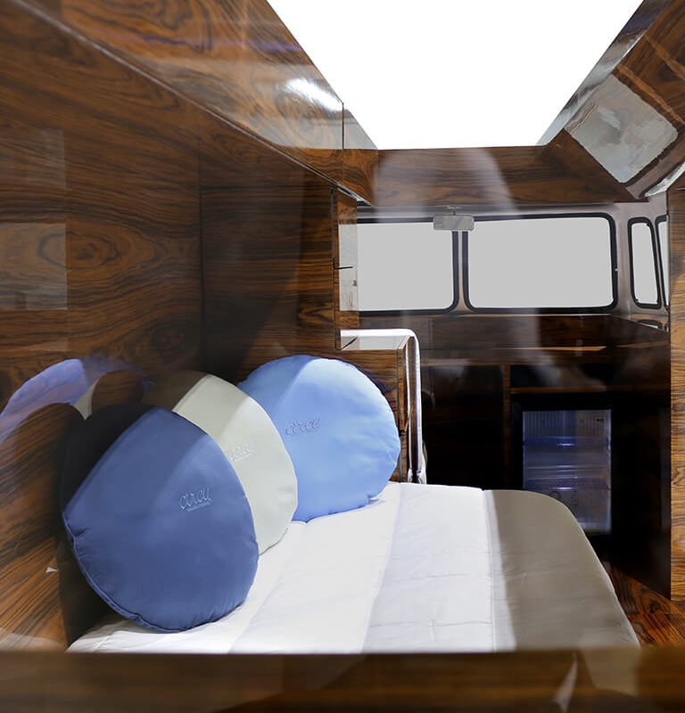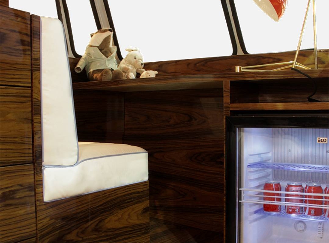 Está disponível com a “carroçaria” em fibra de vidro pintada em azul, rosa e negro, mas todos os pormenores exteriores podem ser configurados a gosto. No interior, completamente revestido em madeira, está a cama com 1,90 por 0,90 metros, uma secretária com tomadas de corrente, um minibar com frigorífico, sofá e televisão.