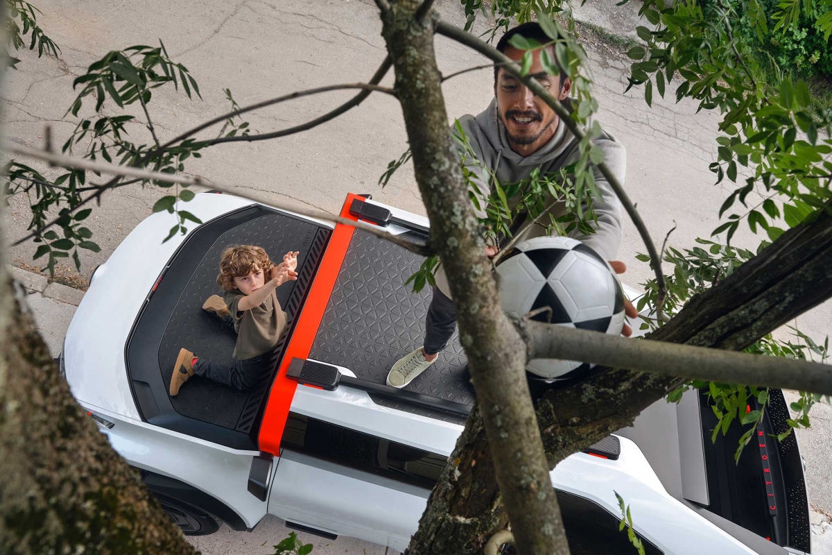 o tejadilho é feito numa estrutura alveolar de cartão prensado reforçada com fibra de vidro, pesa apenas 6 kg e suporta o peso de um adulto