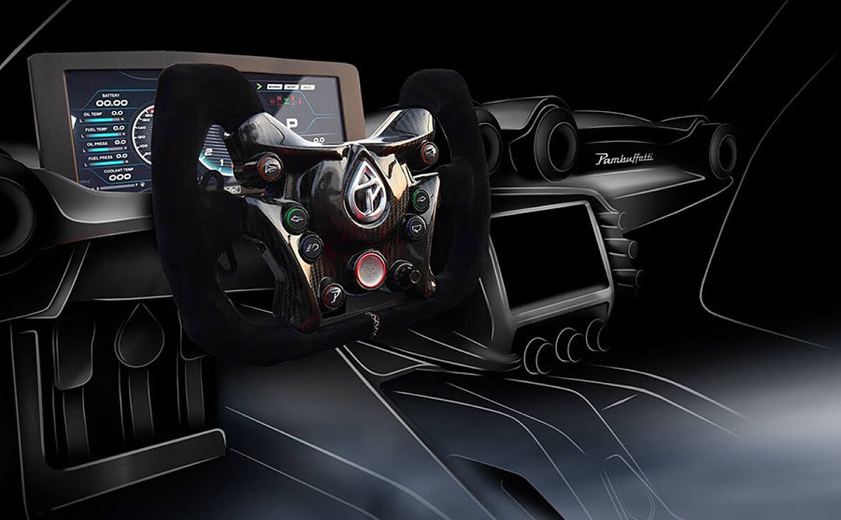 O PJ-01 será o primeiro modelo da Pambuffetti Automobile e, ainda no papel, já promete. Entre as caraterísticas mais especiais inspiradas na competição está a posição de condução extrema, pensada ao milímetro para potenciar as sensações ao volante. Os pedais estão elevados em relação ao assento do condutor, como nos monolugares, e o volante retangular, em fibra de carbono e alumínio, também imita os da Fórmula 1. Inclui vários controlos configuráveis, integra um ecrã TFT de 3,5 polegadas e retira-se para facilitar a entrada e a saída do condutor.