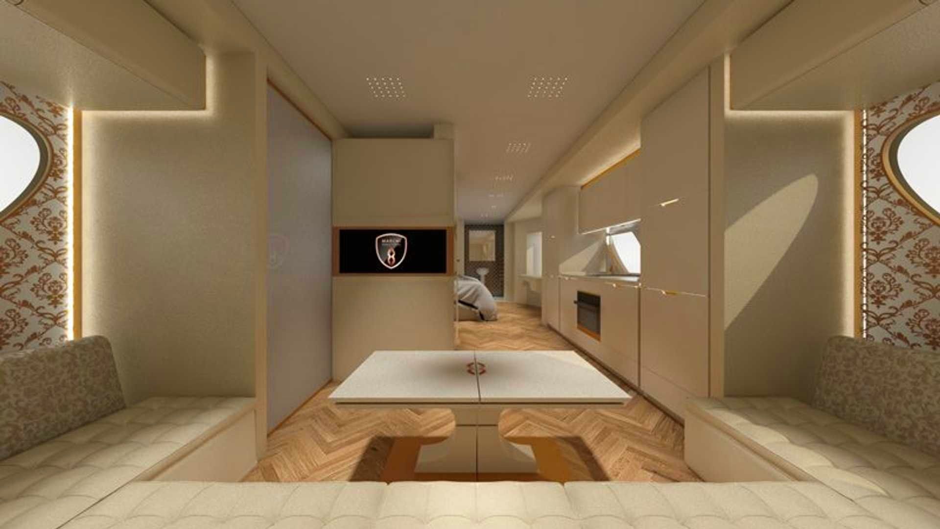 No interior, os ocupantes beneficiam do sistema de ar condicionado especialmente desenvolvido para garantir uma temperatura interior confortável e ainda evitar o excesso de pressurização quando as extensões exteriores deslizam. Além disso, diferentes zonas de temperatura podem ser programadas e um sistema de circulação de ar contínuo garante a melhor qualidade do ar em todos os momentos. Na zona de convívio há um sofá com 4 metros, bar, um armário especial para vinhos e uma máquina de gelo. A cozinha está totalmente equipada, enquanto a casa de banho, discretamente separado da sala de estar e do quarto principal, inclui Spa. Na suite, destaque para a cama “king size” fabricada pela empresa que fornece a família real britânica.