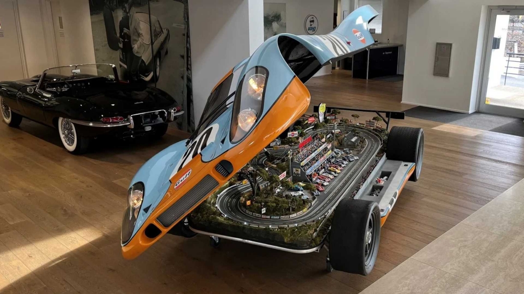 Criada pelos norte-americanos da Slot Mods Raceway, a pista com cerca de 4 metros de comprimento e quase 2 metros em largura recria o cenário do filme “Le Mans” de 1971 e está instalada no interior de uma réplica do mítico Porsche, o #20 pintado com as icónicas cores da Gulf conduzido por Michael Delaney no filme, o personagem interpretado por Steve McQueen.