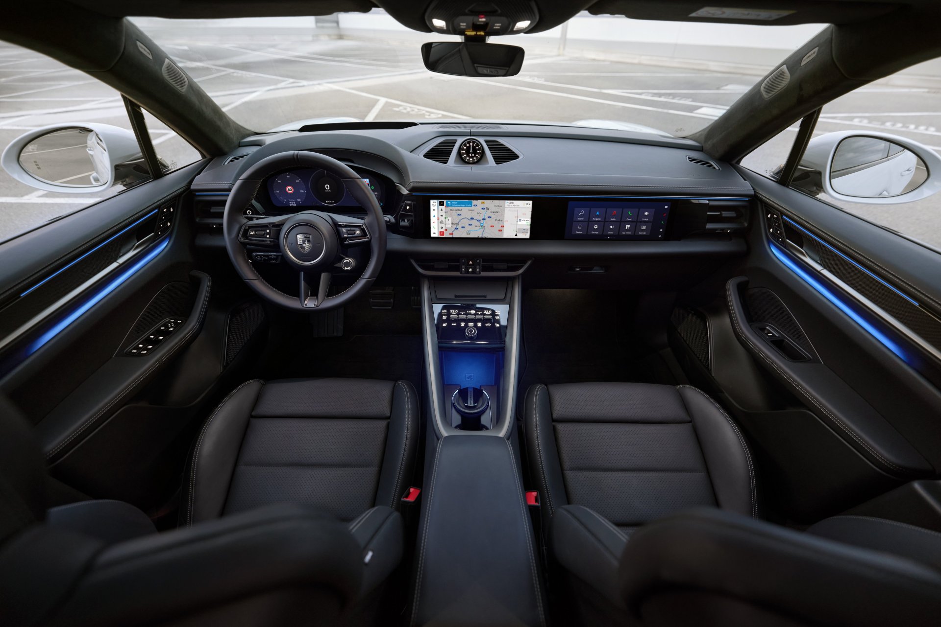 O interior combina sofisticação, qualidade e tecnologia, com um painel de instrumentos curvo de 12,6 polegadas, um ecrã central de 10,9 polegadas, e um outro ecrã opcional para o passageiro com o mesmo tamanho, que permite controlar o sistema de infotainment ou transmitir conteúdos de vídeo. Pela primeira vez, o Macan inclui um head-up display com realidade aumentada, integrando elementos de navegação no campo de visão do condutor.