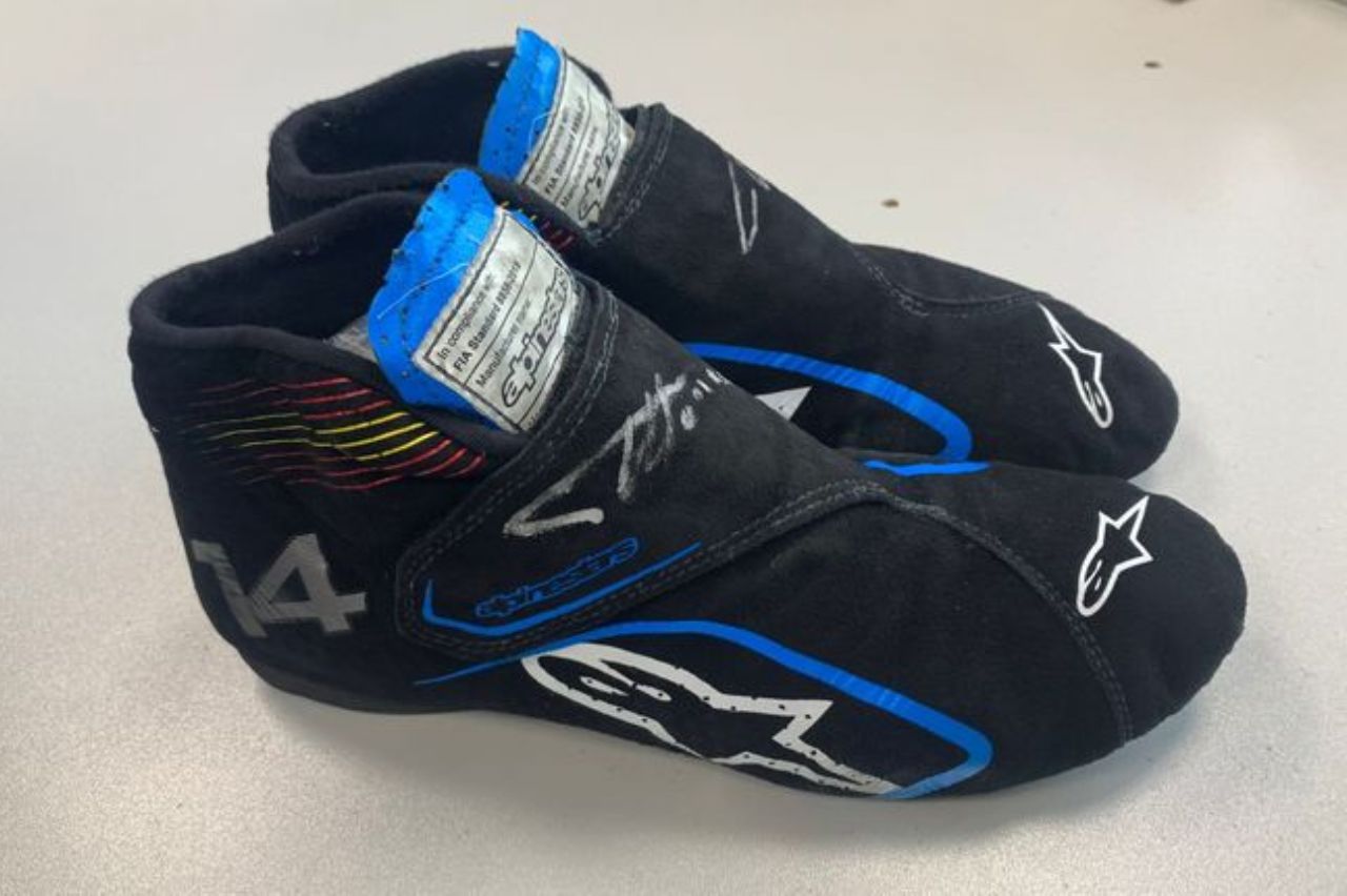 As botas de Alonso a leilão são da prestigiada marca de acessórios desportivos Alpinestars e têm acabamento em tecido preto, com detalhes em azul e uma gravura com as cores da bandeira espanhola, além da inscrição do número 14 que o piloto asturiano usa na categoria principal do automobilismo. As botas estão autografadas por Fernando Alonso.
