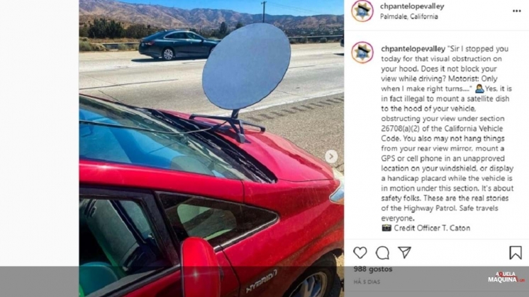 Surpreendidos com a situação insólita, os agentes da polícia de Antelope Valley, em Palmdale, a norte de Los Angeles, partilharam imediatamente o episódio nas redes sociais, lembrando que é expressamente proibido instalar objetos no para-brisas, que possam bloquear a visão do condutor, mesmo que seja só a curvar para um dos lados…