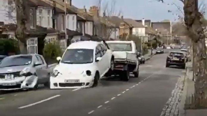 O condutor de um reboque, que fazia o transporte de um Volkswagen Beetle batido, atingiu todos os automóveis que encontrou estacionados na berma da estrada, enquanto seguia, sem abrandar, rua abaixo!