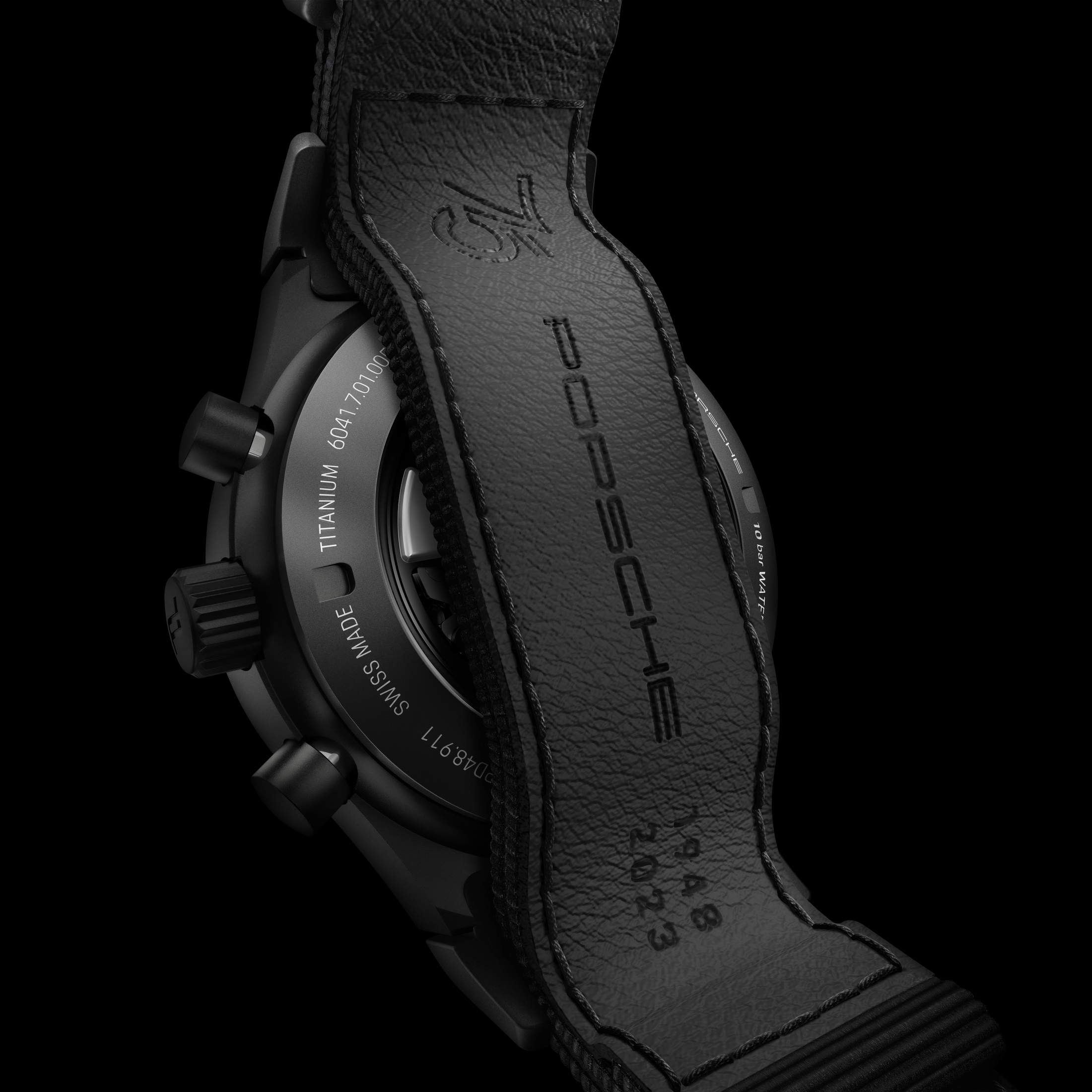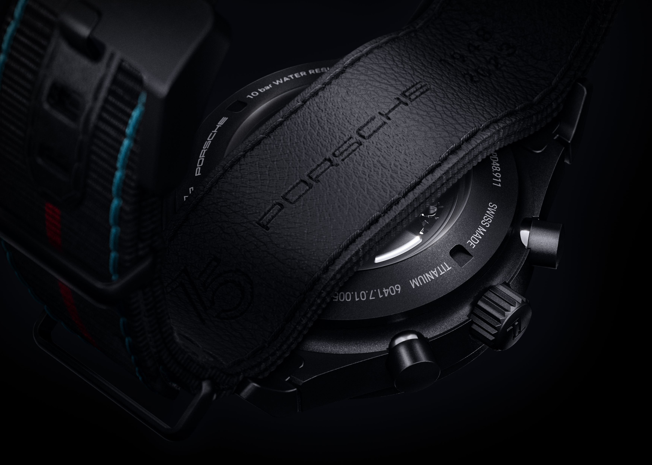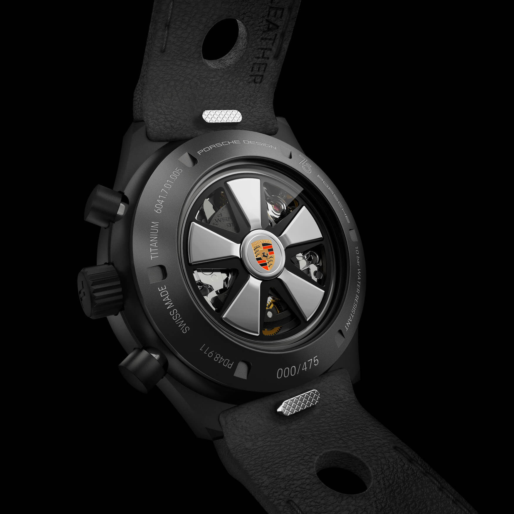 A caixa é em titânio, remetendo para a construção ligeira dos icónicos automóveis desportivos, enquanto o anel em torno do mostrador imita o desenho das jantes e liga leve Fuchs com um brasão colorido da Porsche ao centro.