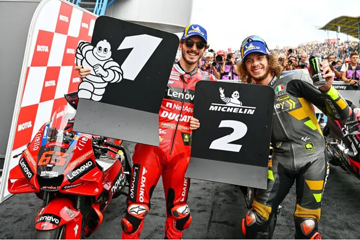 Finalmente, na categoria rainha, o fim de semana foi quase épico e por vários motivos e com diferentes protagonistas! O rapidíssimo, Bagnaia da Ducati Lenovo Team ficou com a vitória, mas não foi assim tão simples! Vinha secundado pelo líder do campeonato, Quartaro, em Yamaha, que teve uma queda, voltou à prova para cair de novo e abandonar. Bezzecchi, da Mooney VR46 Racing Team, subiu pela primeira vez ao pódio e logo com um segundo lugar, sendo que no lugar mais baixo do pódio ficou Viñales da Aprilia Racing. Uma prova verdadeiramente intensa, com as Aprilia muito fortes.