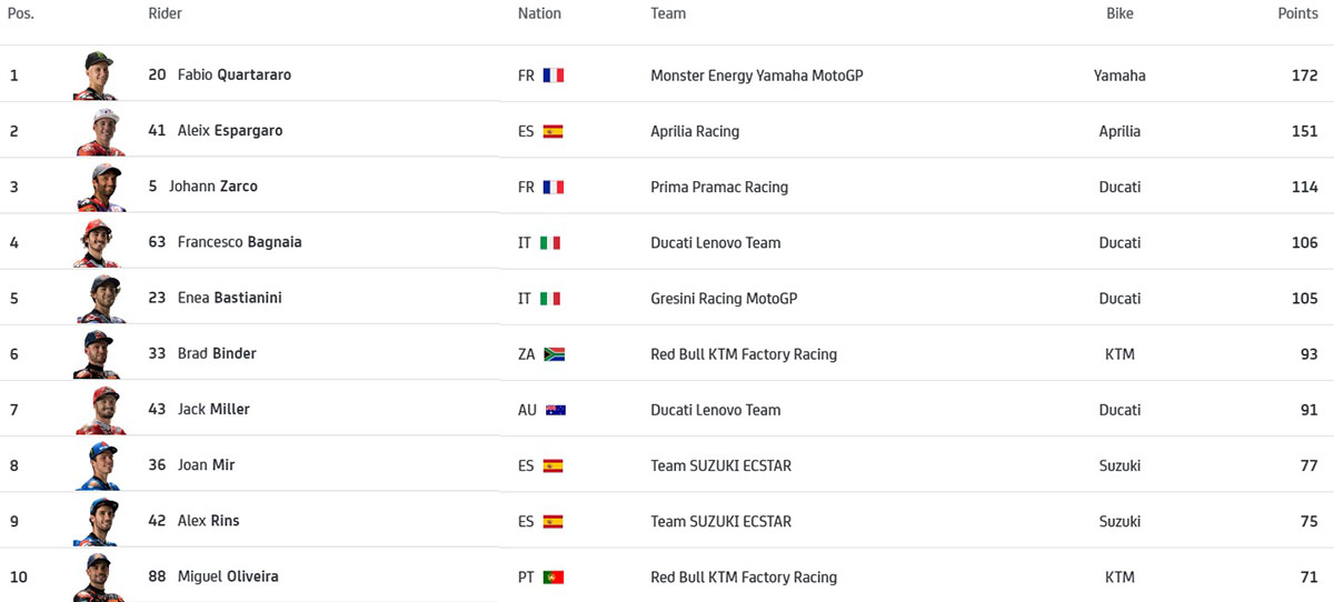 Quartaro mantém a liderança do mundial, mas a distância para Espargaro é menor, sendo agora de 21 pontos! Oliveira fica na décima posição com 71 pontos, menos 22 que o seu colega de equipa, Binder, que ocupa a sexta posição.