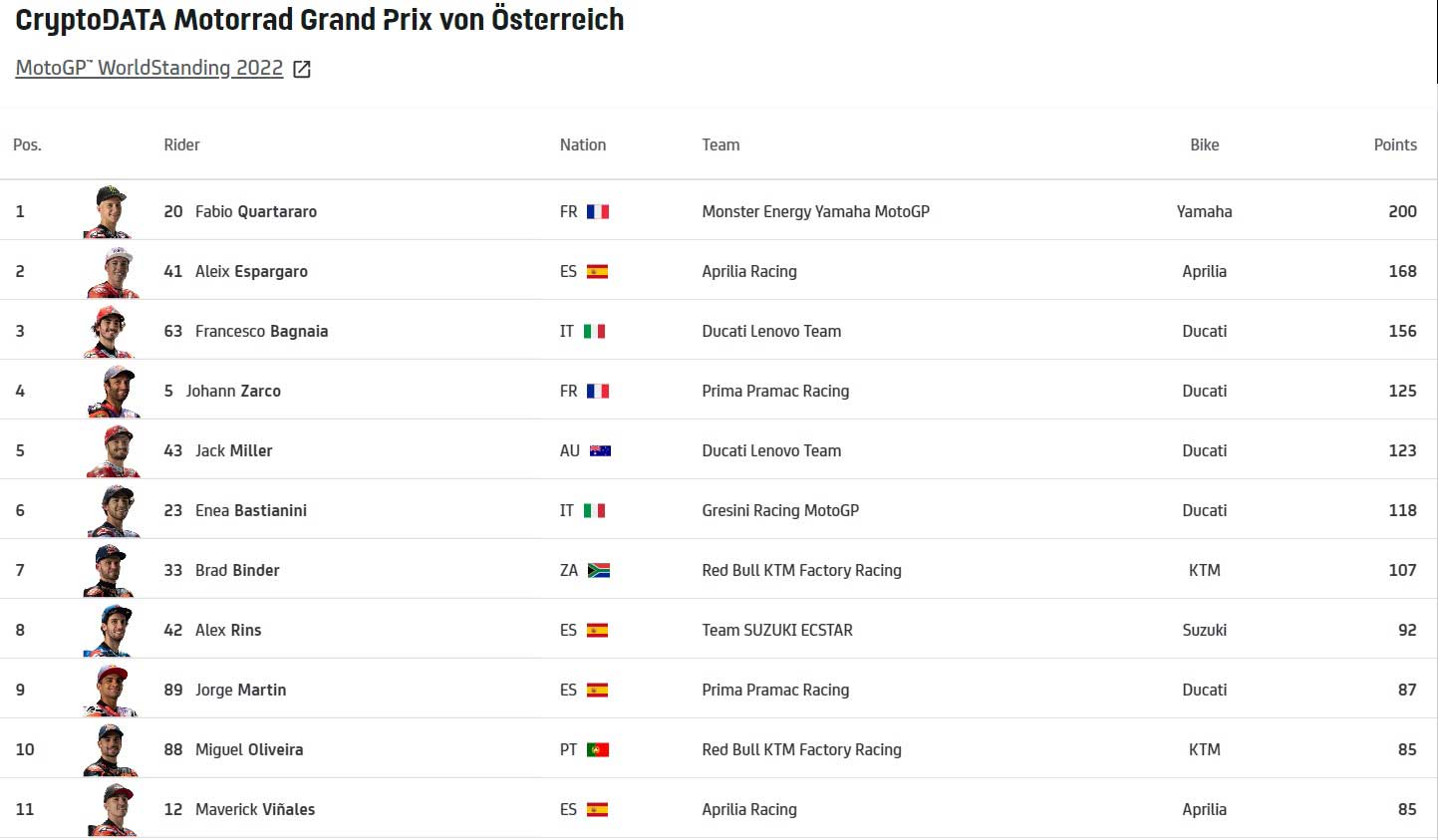 O “nosso” Miguel Oliveira não teve um bom fim de semana e logo frente ao país da sua equipa e numa pista que conhece bem. Iniciou a prova em 17.º e terminou num igualmente modesto 12.º. Talvez que a incerteza que rodeia ao seu futuro, agora ainda mais badalada com a hipótese de ir correr para a novíssima equipa GasGas, lhe esteja a dificultar a vida. Tem agora o mesmo número de pontos, 85, que Maverick Vignales que é 11º.