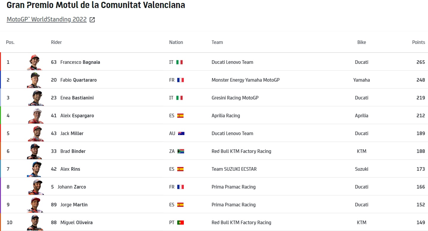 Nota mais ainda para Binder que levou a KTM ao 2.º lugar nesta prova e para Bastianini que acabou por fechar a temporada em 3º lugar com a sua Ducati, ultrapassando Aleix Espargaro e a Aprilia que tiveram um mau fim de semana.