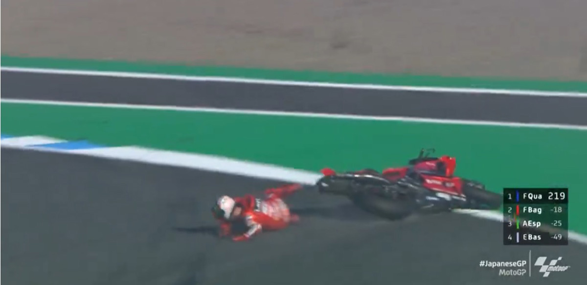 Na prática, tudo continua em aberto, para as 4 provas que faltam! Quartaro tem agora 219 pontos, “Pecco”, que caiu quando dava o “tudo por tudo”, mantém os mesmos 201 pontos e Aleix Espargaro também continua com os mesmos 194 pontos!