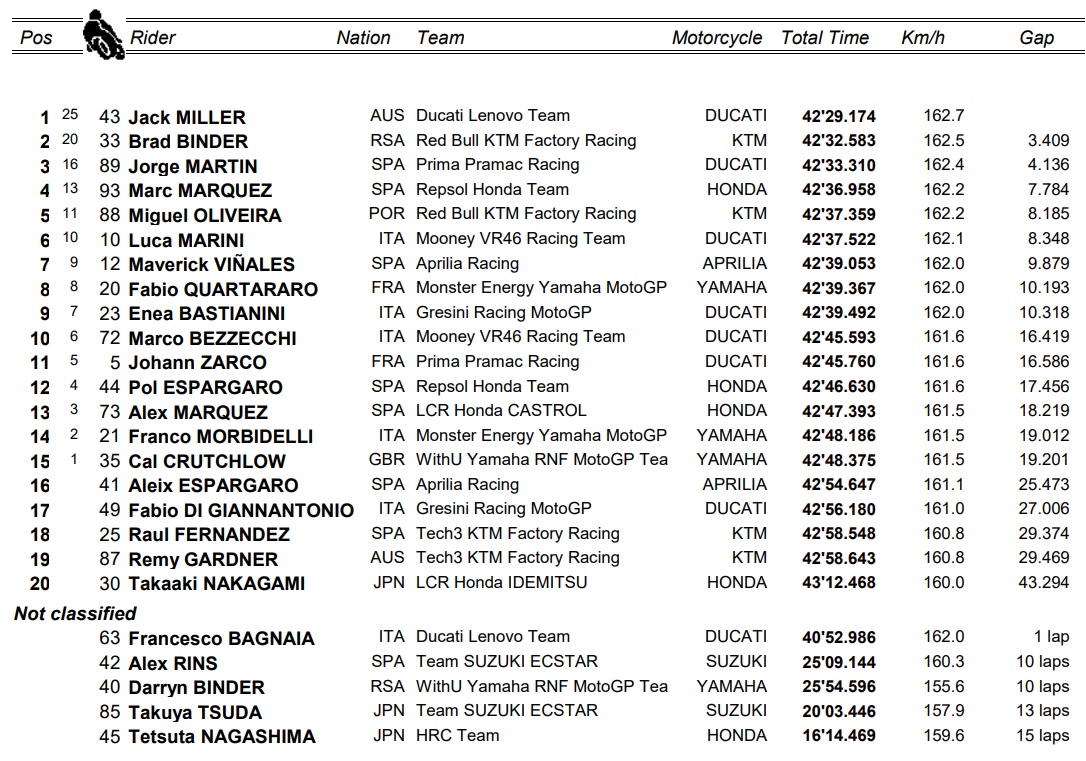 Miguel Oliveira, mostrou toda a fibra de campeão e andou muito tempo a lutar por um lugar no pódio, mas o quinto lugar no final acaba por ser uma boa recompensa. Acabou com a “maldição” de acabar em 11.º lugar, mas continua com esse lugar na tabela geral, mas agora apenas a 2 pontos de distância de Alex Rins.