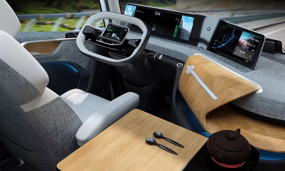 No posto de condução, o Homtruck adota um banco com design ergonómico, dispondo de assistente inteligente (IA), associado a um sistema de camaras 360º que alertam o condutor para tudo o que se passa em torno do veículo, esteja este parado ou em movimento.