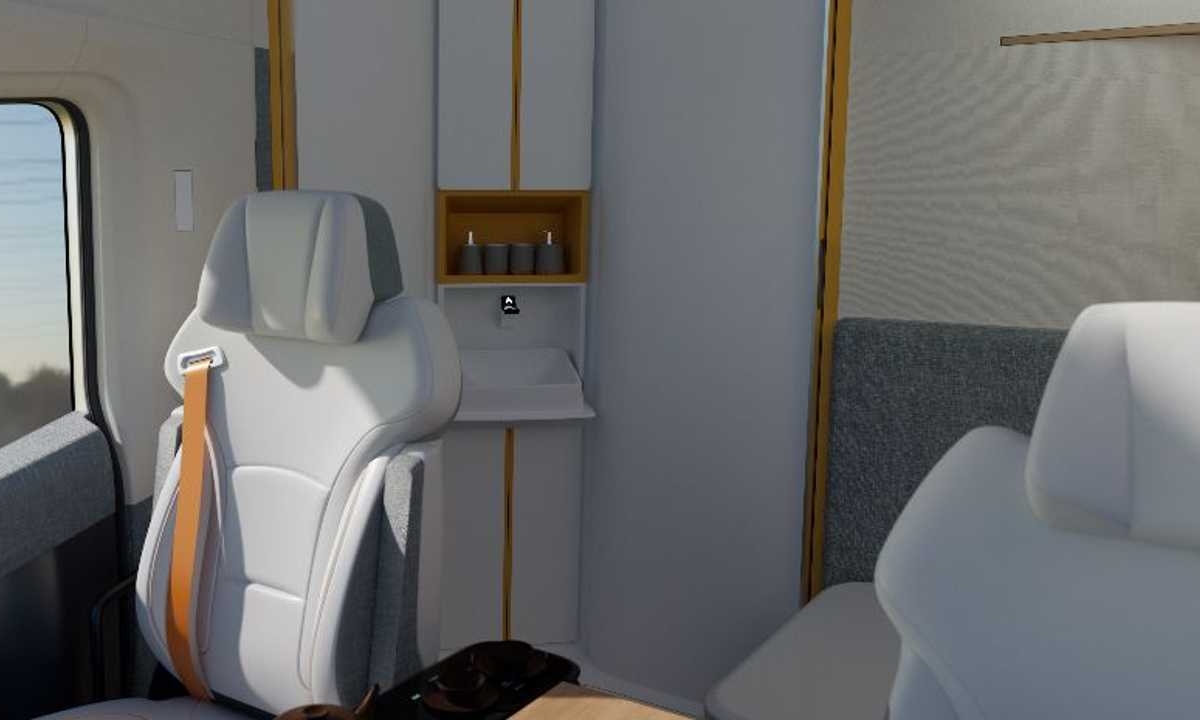 Por isso, o cockpit está dividido em duas áreas bem distintas: condução e bem-estar, sendo esta última composta por uma casa de banho equipada com duche, cama individual, frigorífico, bar com máquina de café e cozinha com máquina de lavar roupa.
