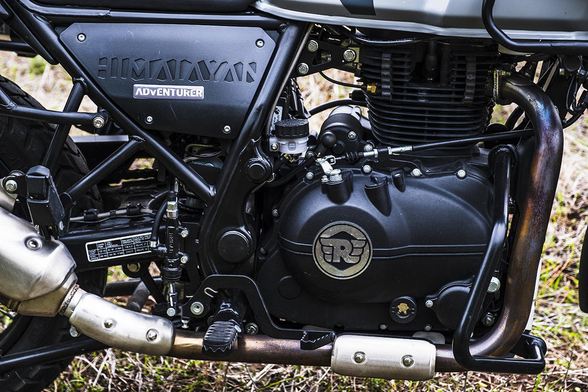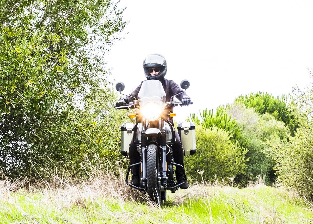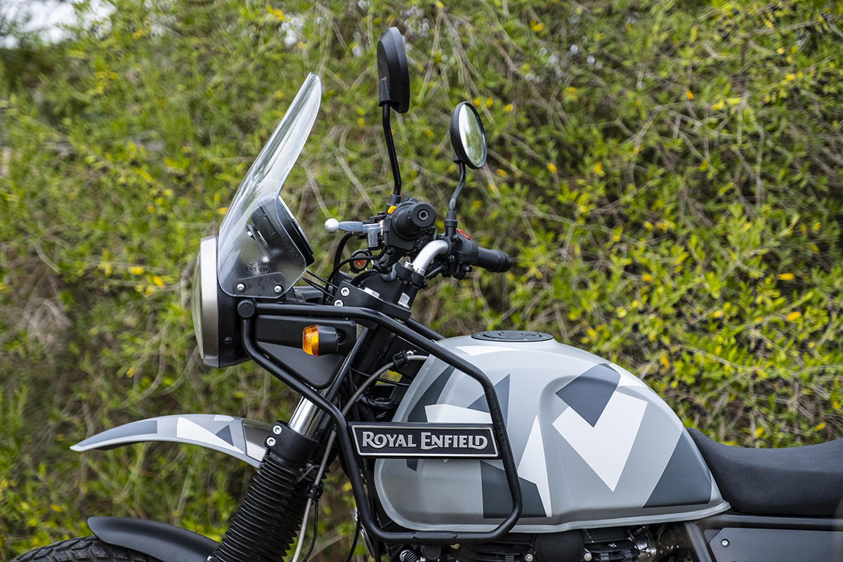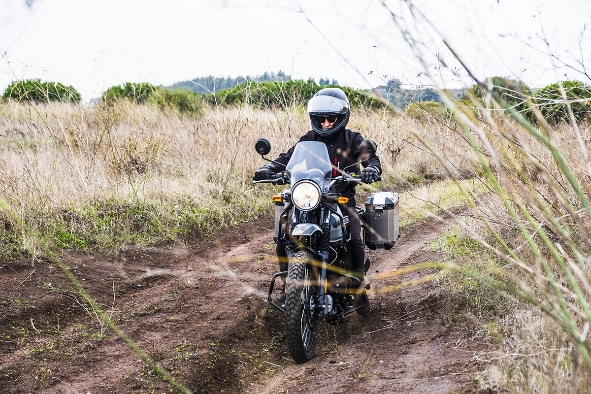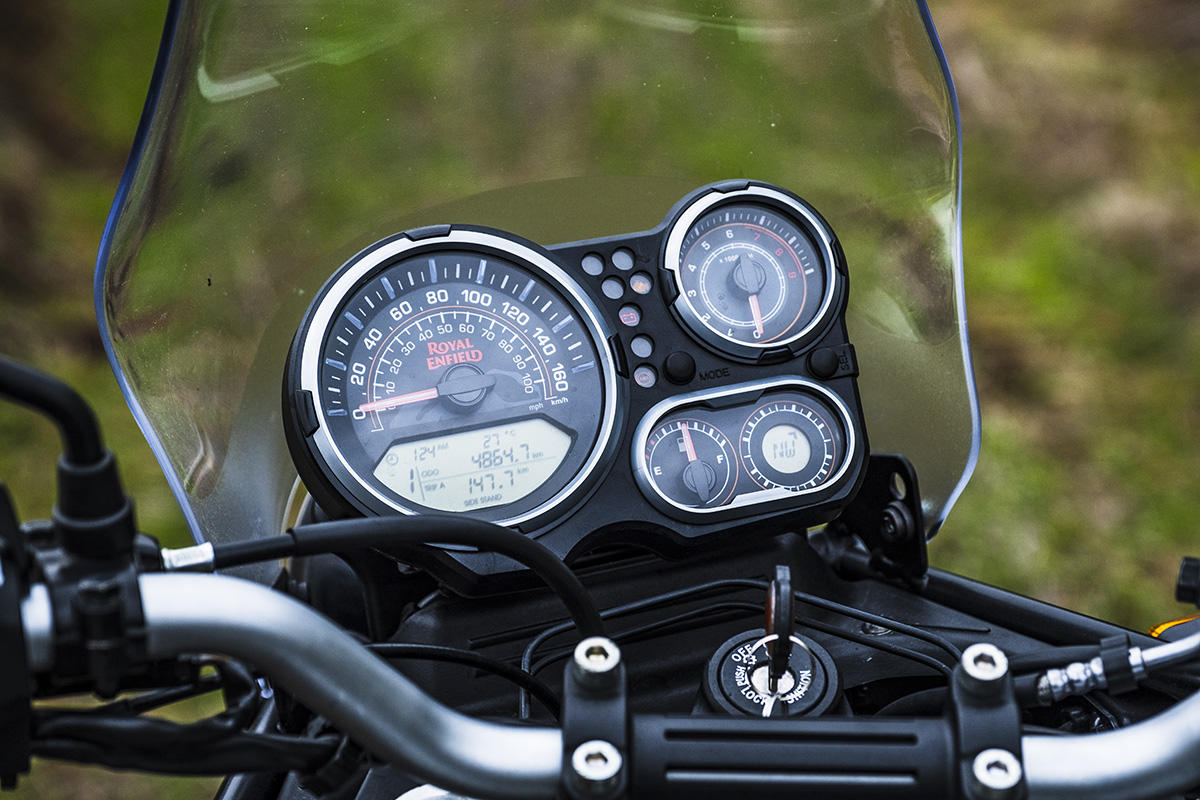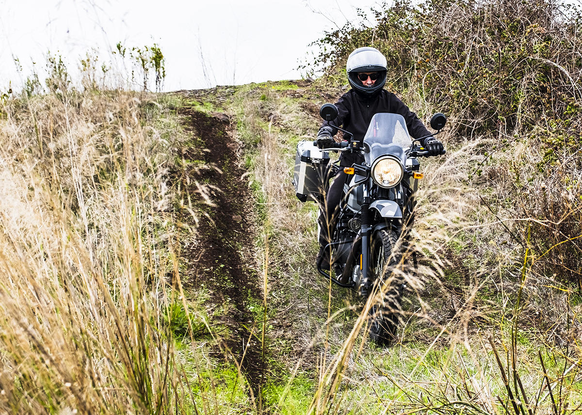 A marca apresenta a Himalayan como tendo sido concebida para se atravessar os Himalaias, a maior cordilheira do mundo. Não fomos tão longe, mas conseguimos perceber que a moto se sente bem por caminhos esburacados, proporcionando muita suavidade nas irregularidades do piso ou em subir pequenos obstáculos. Parte boa: não existe tecnologia nem eletrónica para avariar, apenas um painel de instrumentos básico, sem botões nem luxos – apenas uma bússola! Também as carenagens aqui não fazem falta, mas sim o reforço lateral para servir de proteção em caso de queda.