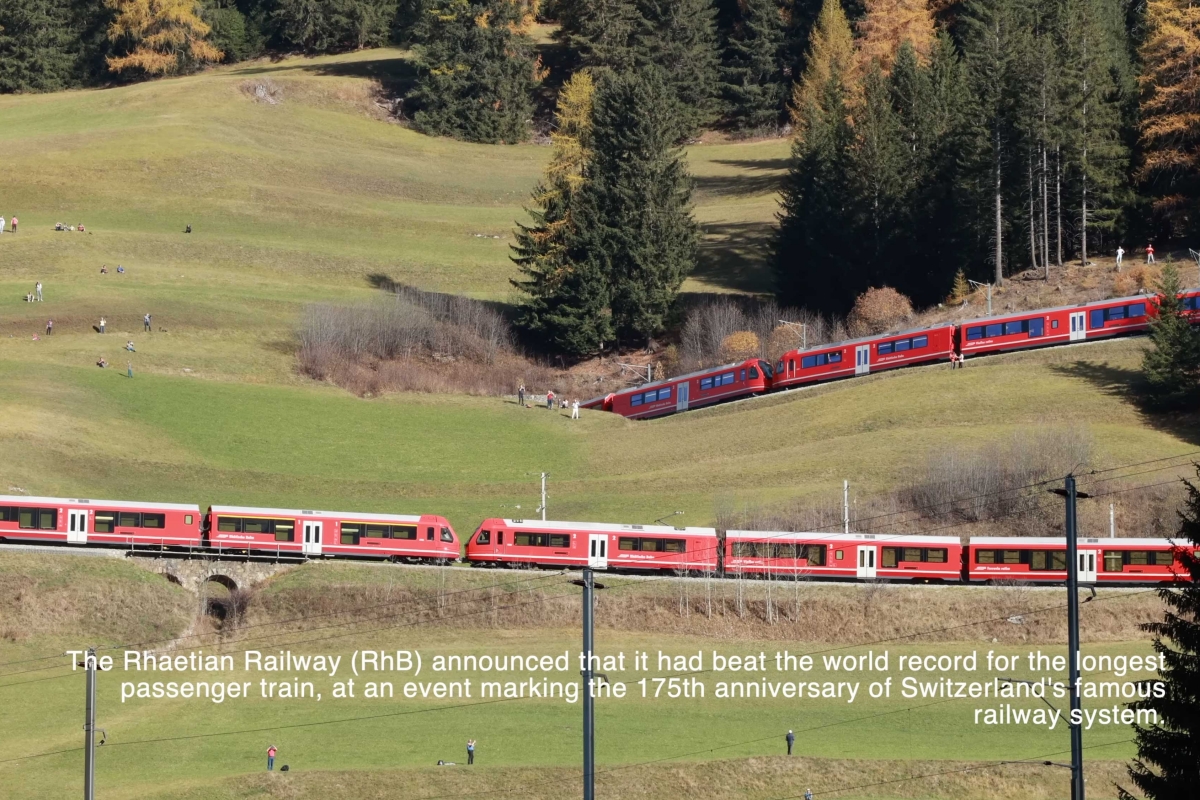 A viagem para validar o recorde conseguido em outubro do ano passado, teve uma duração de pouco mais de 1 hora, e foi feita à velocidade de cerca de 35 km/h, numa rota reconhecida pela UNESCO como pratimónio mundial entre o túnel de Albula, e o viaduto de Landwasser, tendo juntado a proeza de atravessar 48 pontes e 22 túneis pelo caminho.