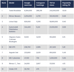 O prometido Roadster de Elon Musk ultrapassa o Rimac Nevera de quase 2000 CV. O supereléctrico croata fica em segundo lugar com 2,3 milhões de buscas Google, 4.739 hashtags no Instagram e 125 milhões de views no TikTok.A fechar este pódio de popularidade, o Lotus Evija, com 829.000 pesquisas no Google searches, 11.295 hashtags e 18 milhões de visualizações no TikTok.