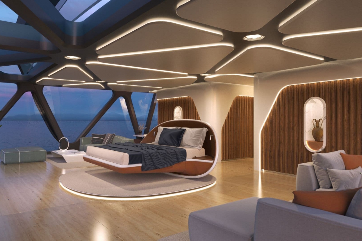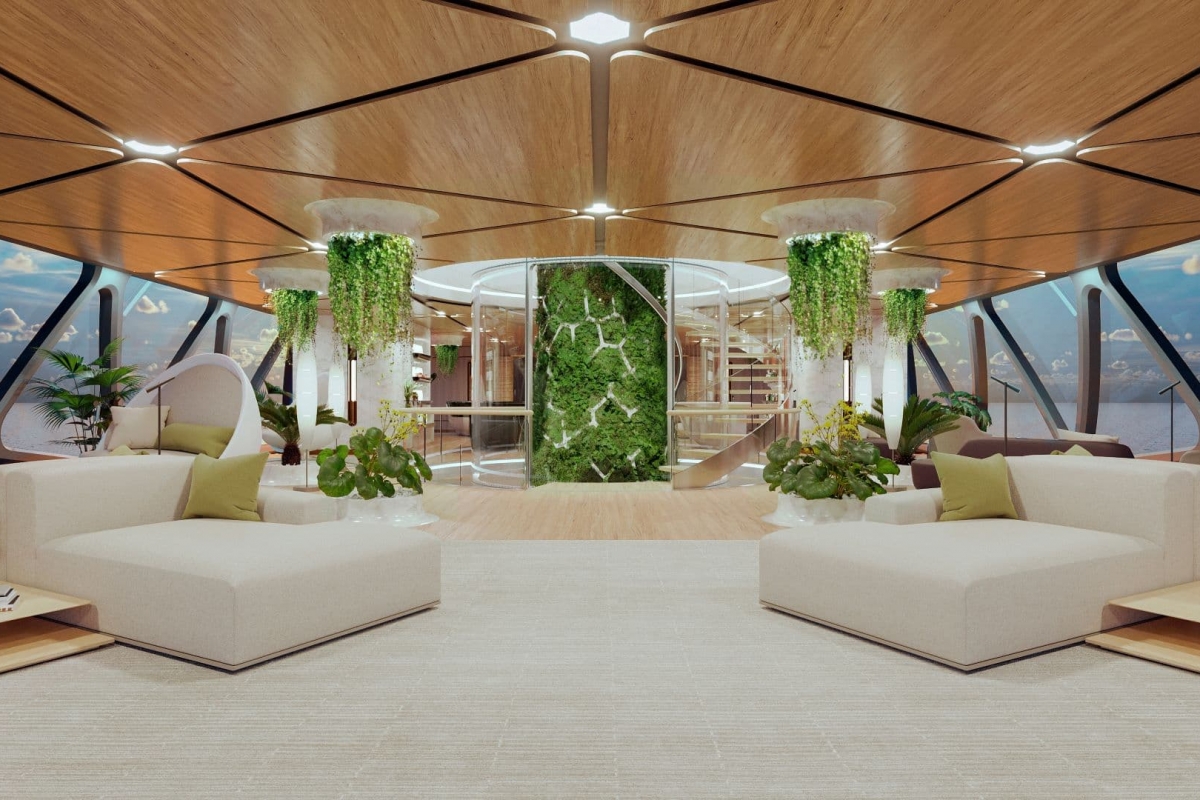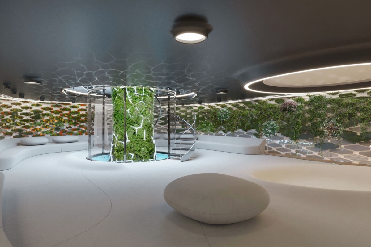 Na zona mais central da embarcação há uma instalação de hidroponia pensada como um jardim que percorre verticalmente todos os níveis do iate, com o intuito de fornecer alimentos frescos para consumo a bordo, ao mesmo tempo que serve para purificar o ar. A base da instalação fica no convés inferior e é cercada pelo “Jardim Zen” que se estende pelos quatro níveis do Pegasus, onde se chega através da escada em caracol. No andar superior foca a suíte master voltada para a frente, com uma vista extraordinária e um grande terraço privativo.