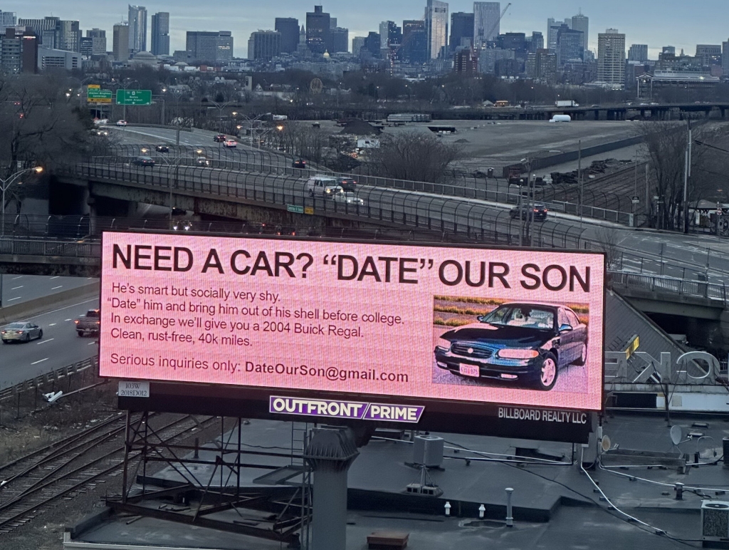 “Precisa de um automóvel? Namore o nosso filho”, é esta a proposta mais ou menos desesperada de um casal gravada em letras garrafais num painel publicitário de berma da estrada, em Allston, um bairro no subúrbio de Boston, nos EUA.