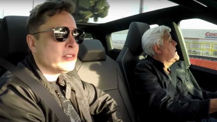 Entre as muitas curiosidades, Jay Leno pergunta porque há necessidade de ter o modelo com vidros à prova de bala. “Porque tem pinta”, responde Musk.