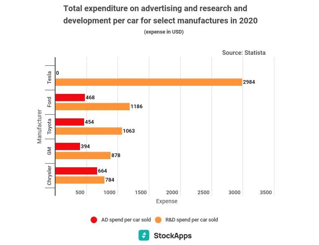 A plataforma online StockApps voltou a compilar os dados relativos aos investimentos em investigação e desenvolvimento (I&D) e publicidade de alguns dos construtores de automóveis mais relevantes no mercado norte-americano, concluindo uma vez mais que todo o modelo de negócio da Tesla confirma o seu estatuto de marca à parte.