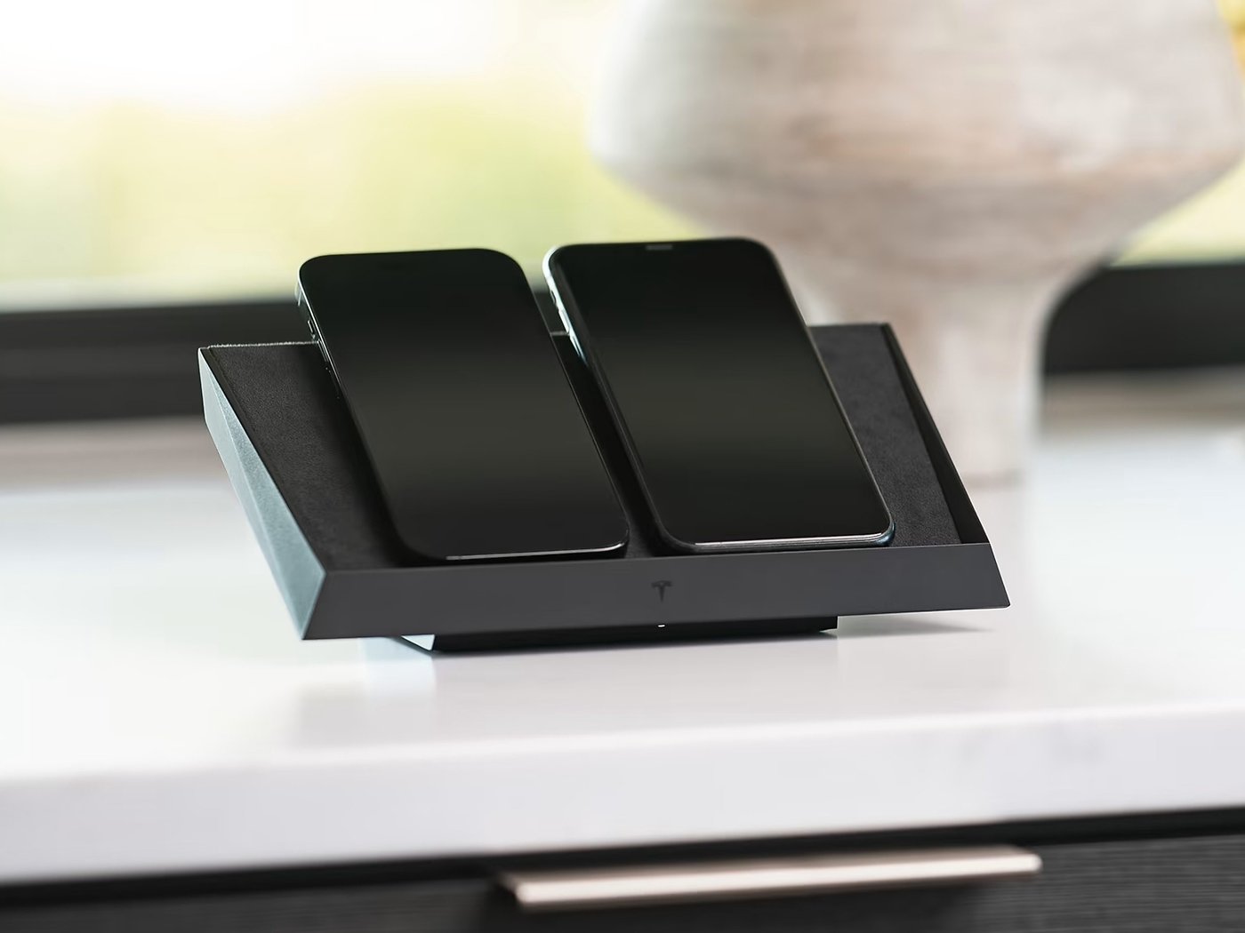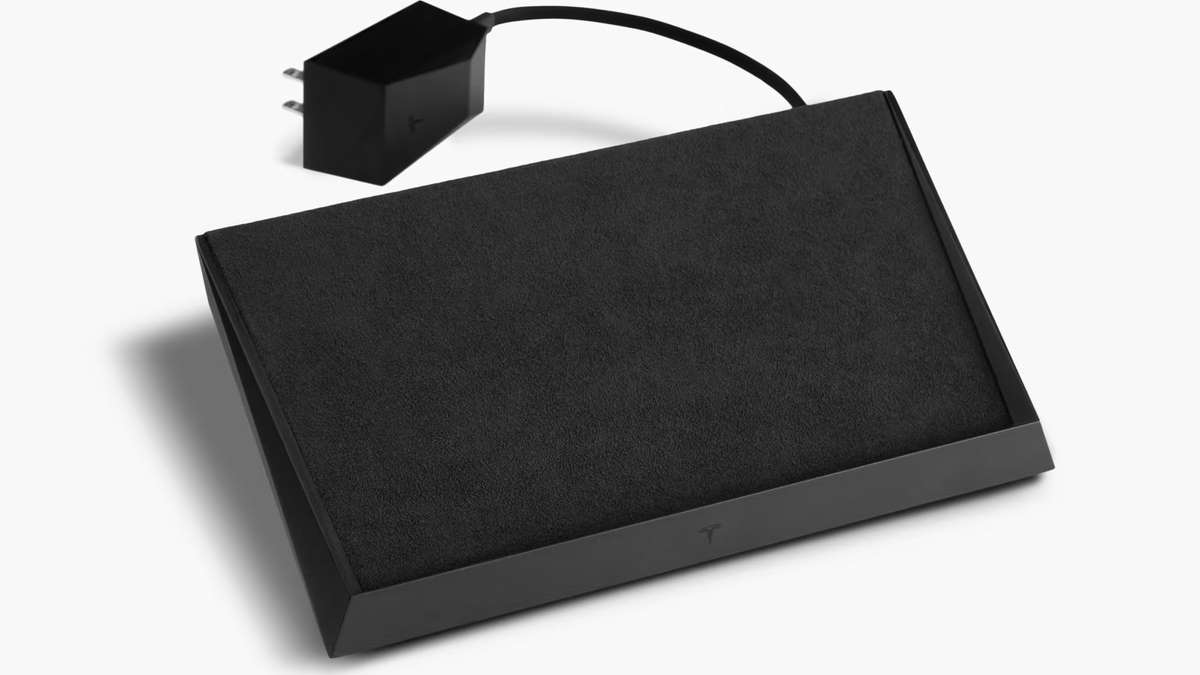 A plataforma de carregamento para secretária da Tesla permite carregamentos sem fios de até 15W por equipamento, até um máximo de 3 dispositivos em simultâneo, compatível com smartphones, smartwatches ou outros.