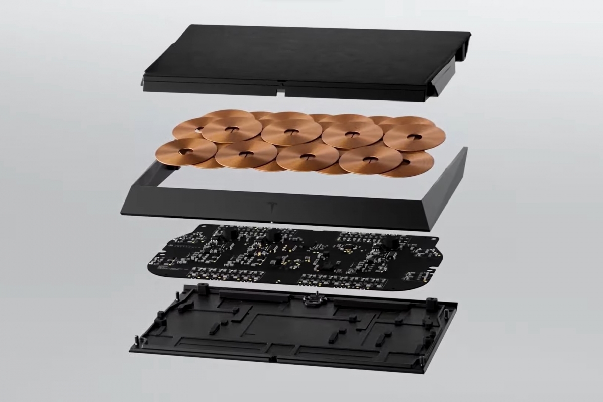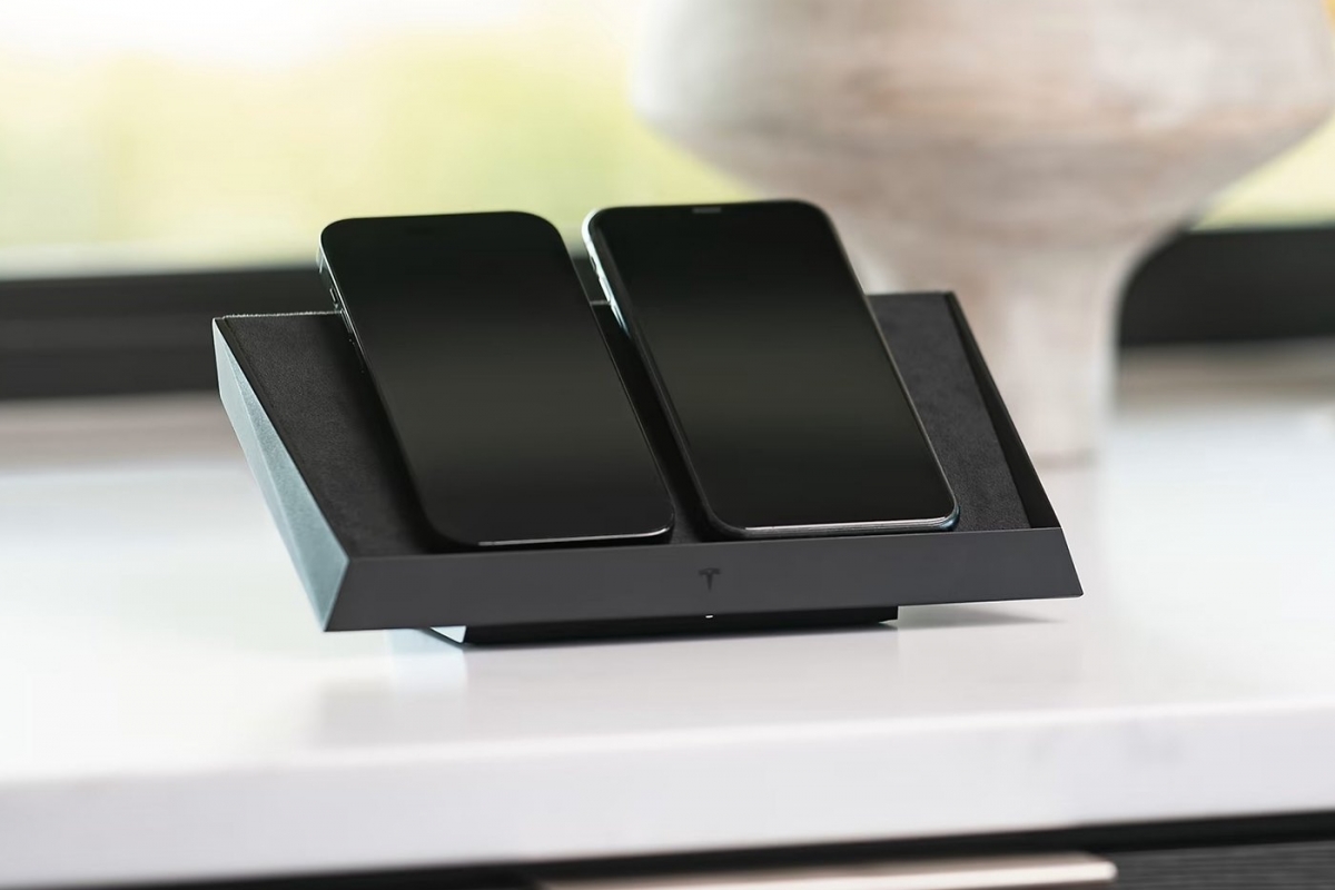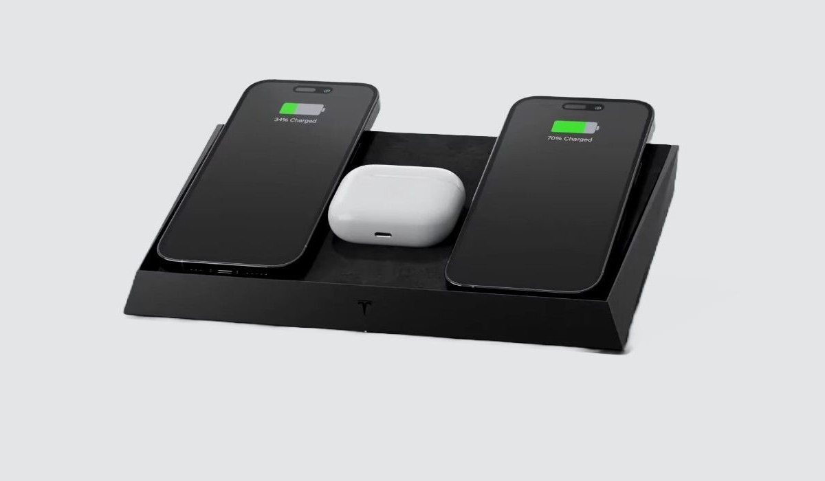 A plataforma de carregamento para secretária da Tesla permite carregamentos sem fios de até 15W por equipamento, até um máximo de 3 dispositivos em simultâneo, compatível com smartphones, smartwatches ou outros.