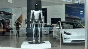 O robô humanóide, ou mais exatamente uma réplica em tamanho real do Tesla Optimus, estará a partir de agora exposto nos centros da marca em Manhattan, Nova Iorque, a funcionar apenas como chamariz.