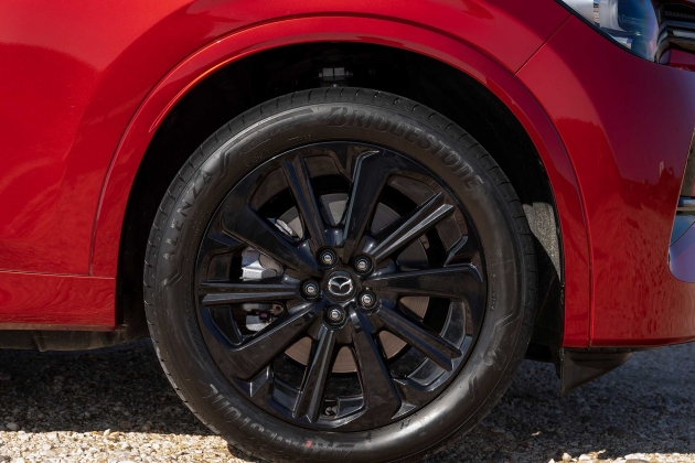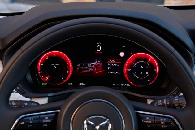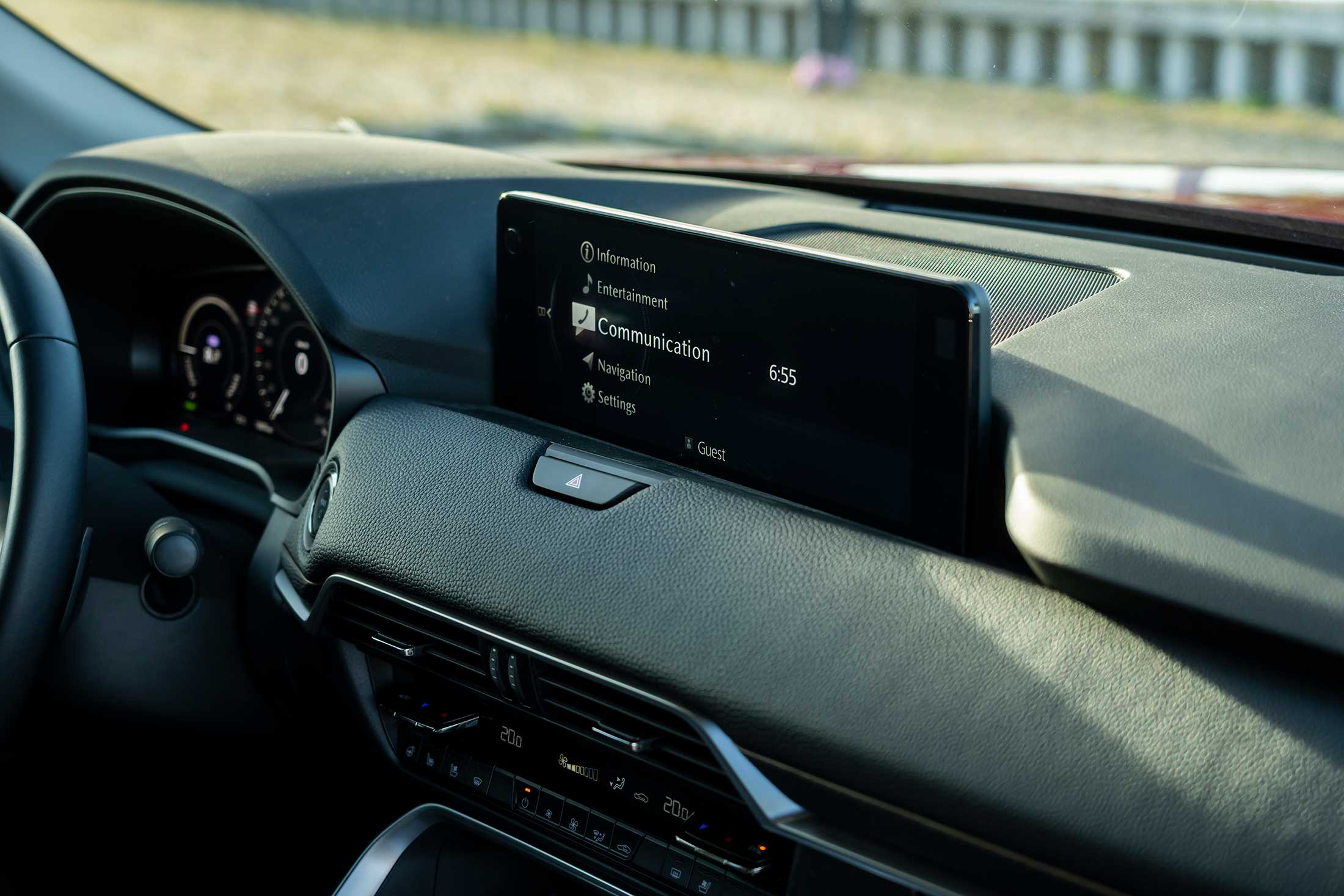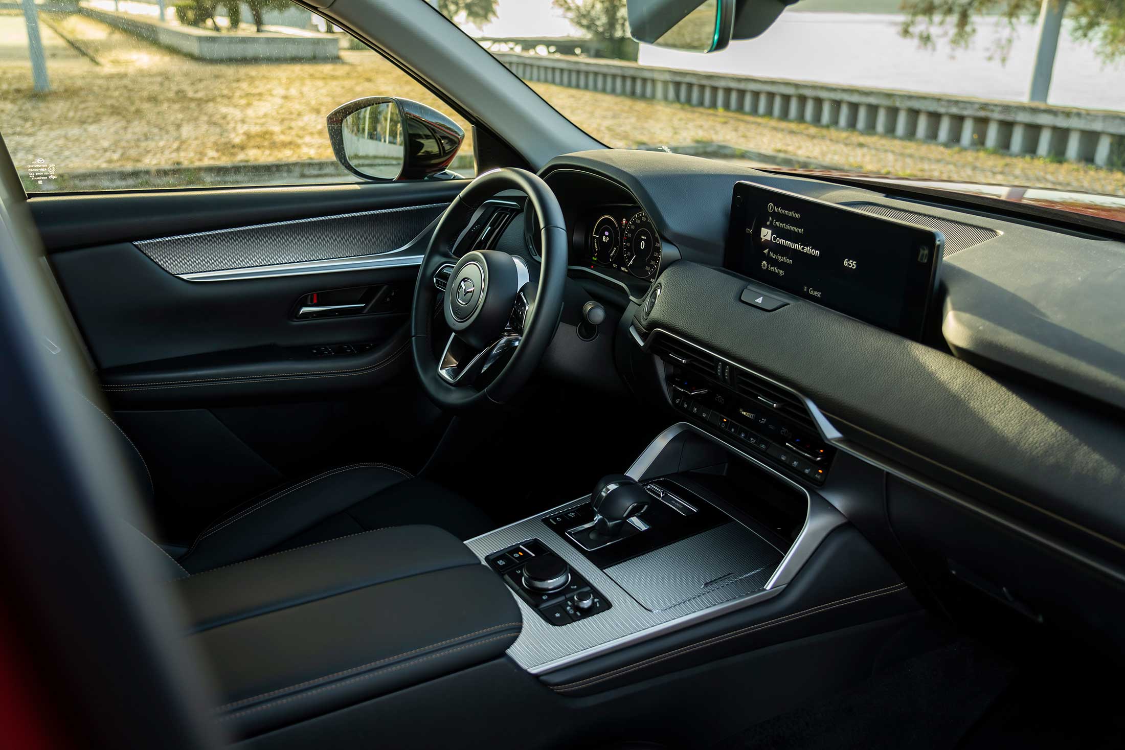 Em andamento temos à disposição cinco modos de condução: EV; Normal; Sport; Offroad; e Towing. Este último é o que deve ser escolhido quando se pretende rebocar uma caravana ou atrelado. Apesar das duas toneladas de peso, em modo puramente elétrico a resposta ao acelerador é imediata, mas que se quer ponderada se pretendemos alcançar os 63 km de autonomia anunciados pela marca. O melhor que conseguimos neste modo foram 46 km. Em modo híbrido obtivemos uma média de 5,4 litros aos 100 km, longe dos 1,5 litros/100 km, anunciados pela marca. A Mazda entende que a melhor forma de utilizar este híbrido plug-in é carregando a sua bateria em casa, ou no trabalho. Por isso não suporta carregamentos rápidos em postos CC. É possível carrega-la em andamento (há um botão específico para isso), ou, ligado a uma wallbox aceita uma potência máxima de 7,2 kW, demorando uma carga 2 horas e 20 minutos a ficar completa.