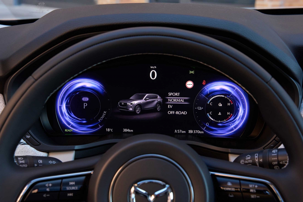 Em andamento temos à disposição cinco modos de condução: EV; Normal; Sport; Offroad; e Towing. Este último é o que deve ser escolhido quando se pretende rebocar uma caravana ou atrelado. Apesar das duas toneladas de peso, em modo puramente elétrico a resposta ao acelerador é imediata, mas que se quer ponderada se pretendemos alcançar os 63 km de autonomia anunciados pela marca. O melhor que conseguimos neste modo foram 46 km. Em modo híbrido obtivemos uma média de 5,4 litros aos 100 km, longe dos 1,5 litros/100 km, anunciados pela marca. A Mazda entende que a melhor forma de utilizar este híbrido plug-in é carregando a sua bateria em casa, ou no trabalho. Por isso não suporta carregamentos rápidos em postos CC. É possível carrega-la em andamento (há um botão específico para isso), ou, ligado a uma wallbox aceita uma potência máxima de 7,2 kW, demorando uma carga 2 horas e 20 minutos a ficar completa.
