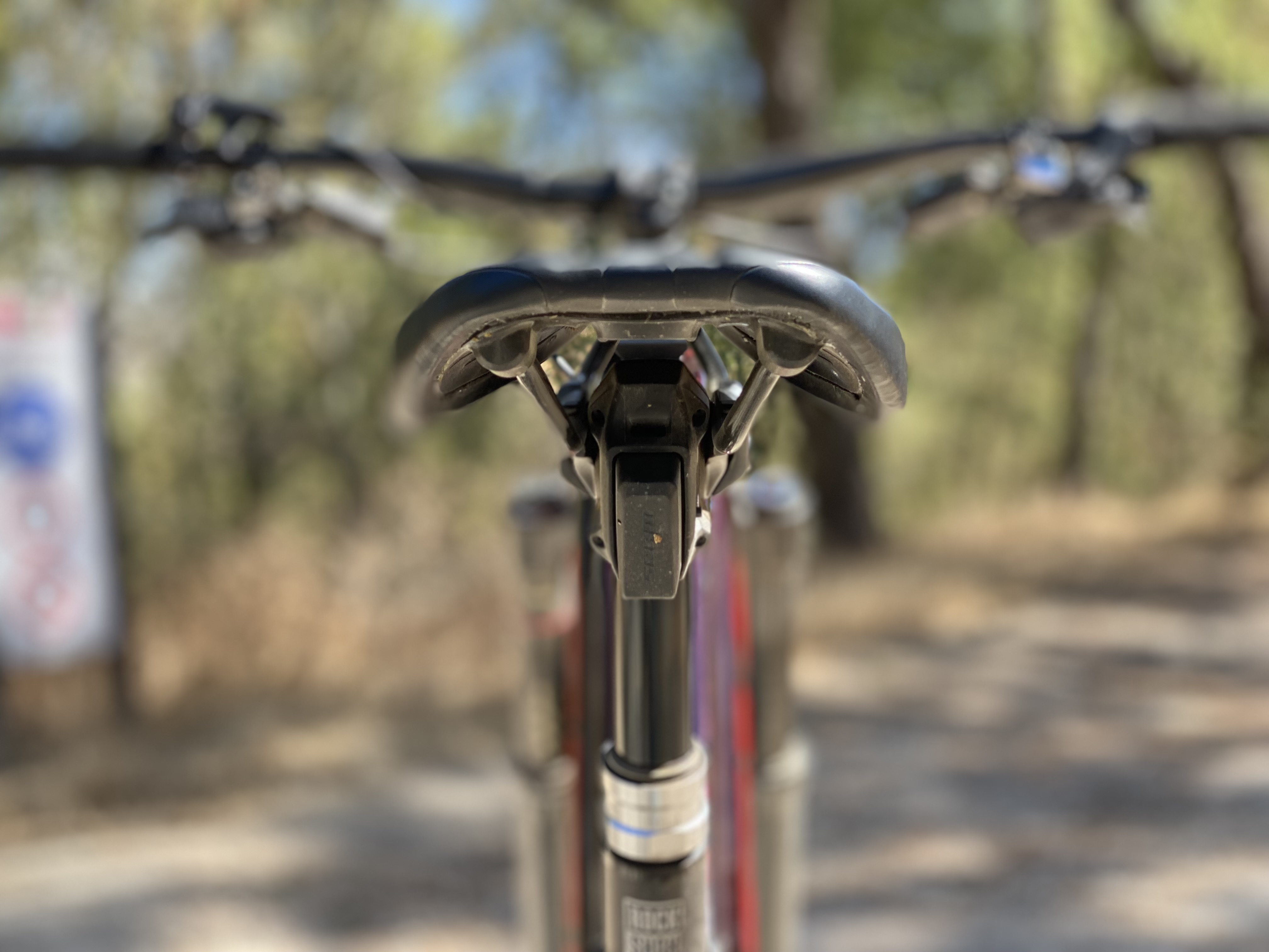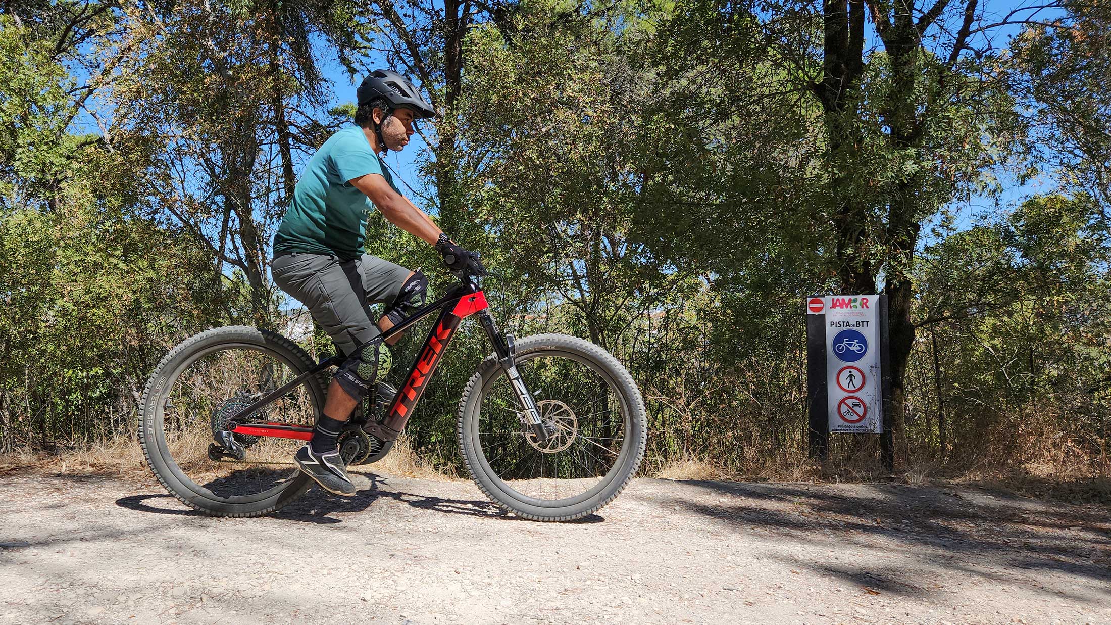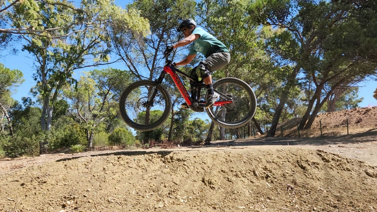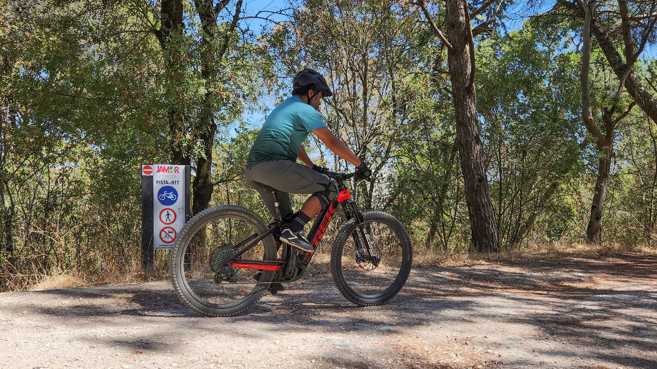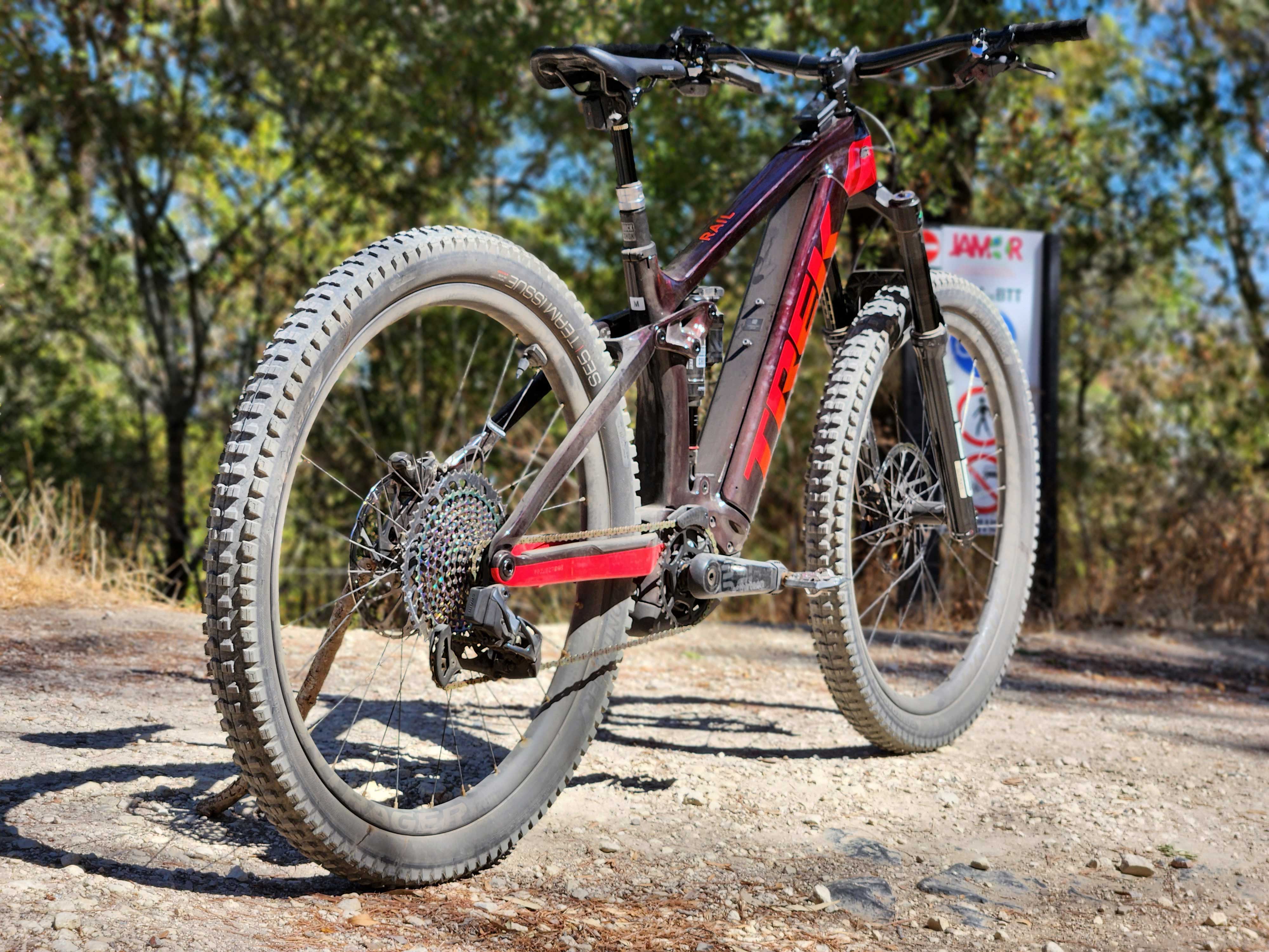 Locais como o Parque do Monsanto, ou as pistas do Jamor parece que foram feitos para esta bicicleta, nos trilhos a Rail 9.9 XX1 AXS demonstrou uma compostura impressionante nas descidas íngremes, com uma ação super suave, tanto do amortecedor RockShox Super Deluxe Ultimate RT3, como da forquilha RockShox ZEB, que passavam por cima de pedras e raízes como se não existissem. O ângulo de direção é mais aberto do que na minha antiga Trek Session de downhill. E o curso do amortecedor e forquilha é igual ao da Trek Remedy que também tive há uns anos. A falta de 50/40 mm de curso em relação à Session, é em parte compensado pelas rodas de 29 polegadas.