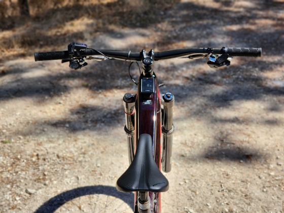 Esta é a bicicleta com mais tecnologia em que alguma vez andei, e como tal, é preciso fazer algumas verificações antes de sair para os trilhos. A primeira coisa a fazer é o download da app SRAM AXS, e de seguida emparelhar a forquilha, o amortecedor, o manípulo das mudanças, o desviador, e as rodas. Caramba! São muitos componentes, mas cada um deles tem, ou um sensor de pressão, ou permite monitorizar o nível de carga da respetiva bateria. De fora ainda fica o espigão de selim hidráulico também sem fios, cujo nível da bateria não é possível monitorizar.Esta é a bicicleta com mais tecnologia em que alguma vez andei