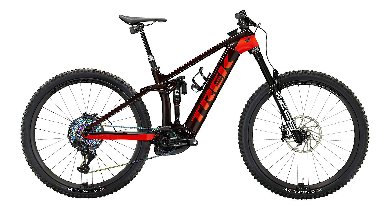 Quadro: OCLV Mountain Carbon, Bateria Integrada Amovível, curso de 150 mm Forqueta: RockShox ZEB Ultimate, curso de 160 mm, máx 170mm Amortecedor: RockShox Super Deluxe Ultimate RT3 Rodas: Bontrager Line Pro 30, Carbono OCLV Mountain, Tubeless Ready Pneus: Bontrager SE5 Team Issue, Tubeless Ready, 29×2.6″, Quarq TyreWiz pressure monitors Manípulo de mudanças: SRAM Eagle AXS, sem fios, 12 velocidades Desviador traseiro: SRAM X01 Eagle AXS Cranque do pedaleiro: E*thirteen E*spec Race em carbono, 34D, comprimento 165 mm Cassete: SRAM XG-1295 Eagle, 10-52, 12 velocidades Selim: Bontrager Arvada, carris em austenita, largura de 138 mm Espigão: RockShox Reverb AXS