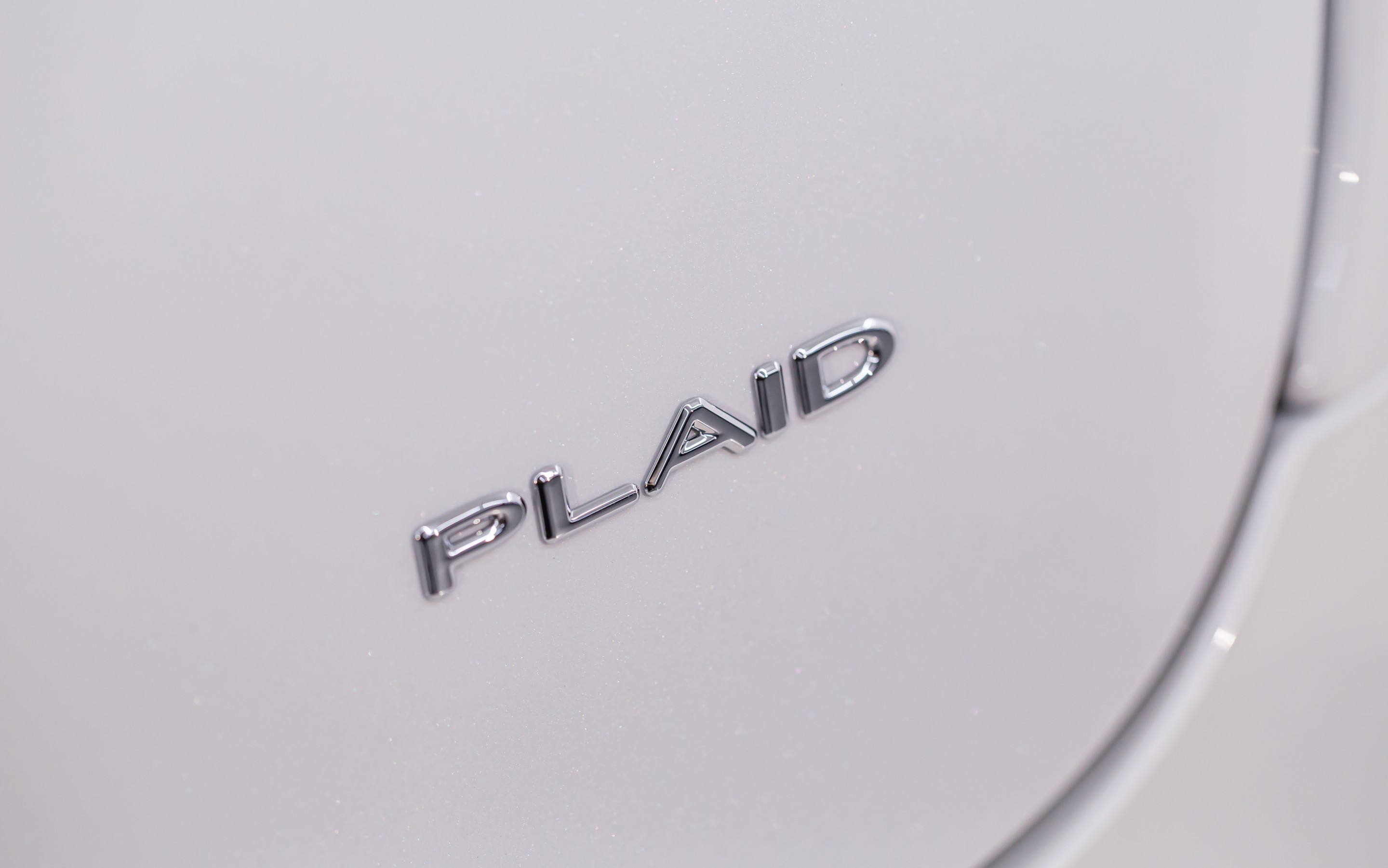 Este é o emblema que passa a distinguir as versões Plaid, com três motores elétricos, em vez do lettering com o nome por extenso.